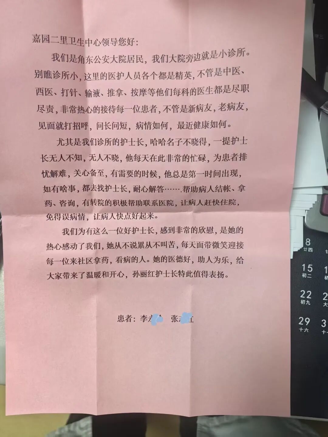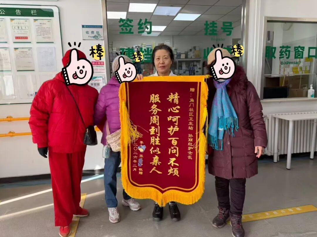 角门东里社区卫生服务站收到辖区公安大院李阿姨、张阿姨送来的锦旗与感谢信,锦旗上“精心呵护百问不烦,服务周到胜似亲人”的字样,成为居民对社区医护人员专业服务与暖心陪伴的最直接认可。