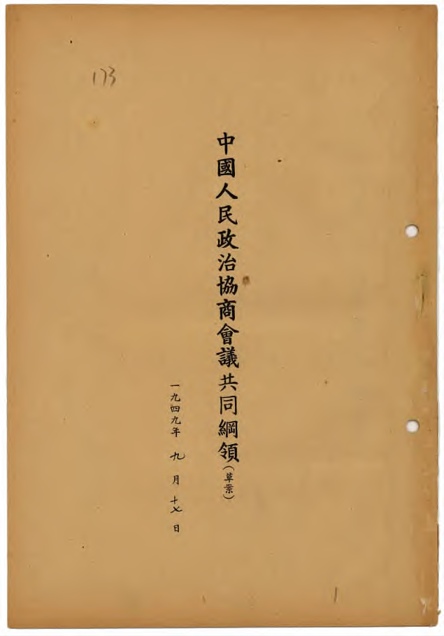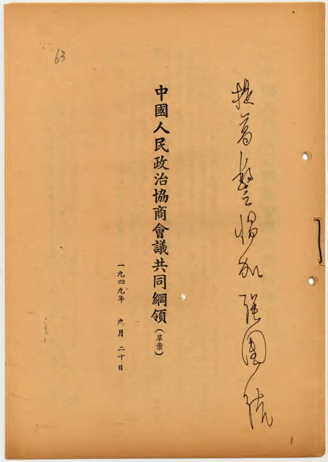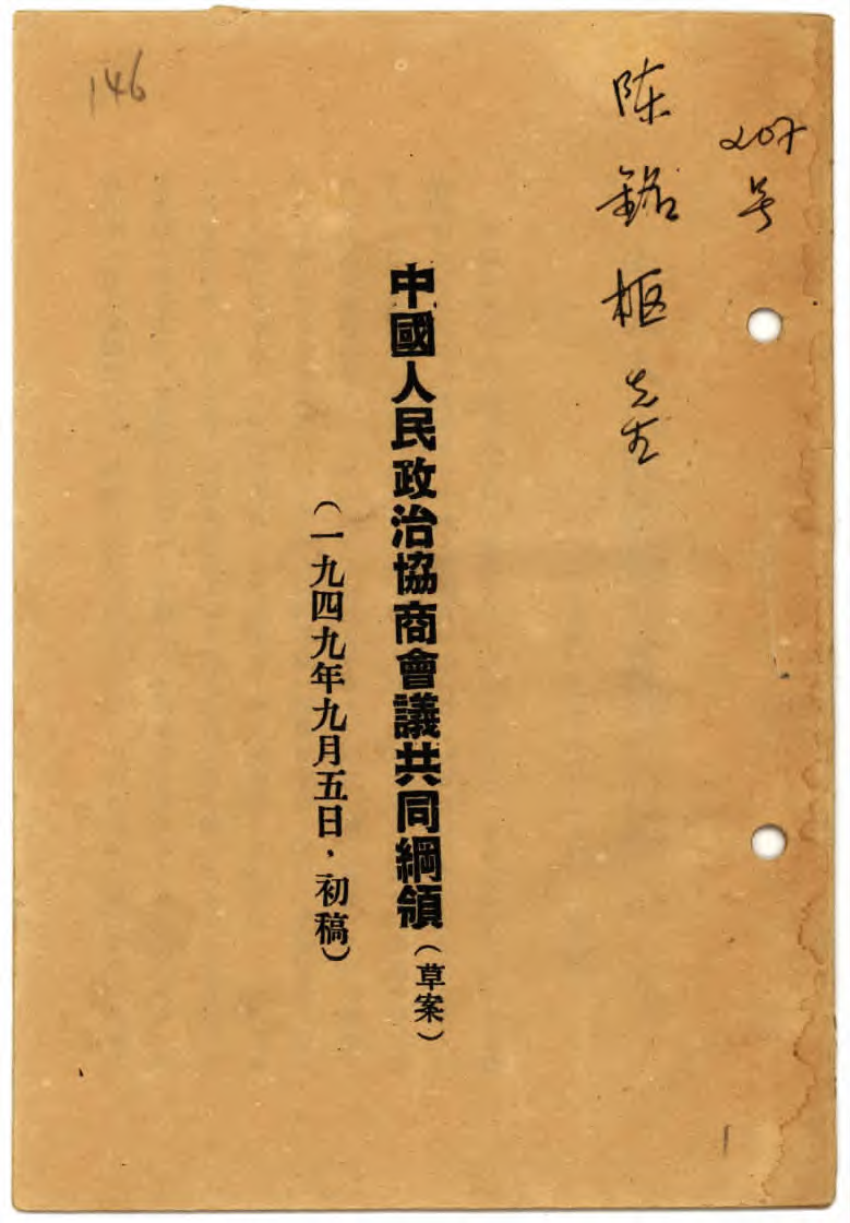 1949年9月5日《中国人民政治协商会议共同纲领》(草案)。该藏品封面题名“中国人民政治协商会议共同纲领(草案)(一九四九年九月五日,初稿)”,右上署“陈铭枢先生207号”,正文为17页装订在一起的铅印稿。此份草案为现今发现的《中国人民政治协商会议共同纲领》第三次起稿阶段最早的一个稿本。1949年9月5日,毛泽东对未标明时间的《中国人民政治协商会议共同纲领(草案)》稿进行修改,修改时在竖排的纲领标题左侧亲笔加上“一九四九年九月五日 初稿”的字样。9月5日初稿清样印出后,毛泽东在9月6日又对该稿作了大量修改。修改时,把文中第二章的章名“政治机构”改为“政权机构”;把第五章“文化教育政策”中第五十条合并到四十九条。这样,纲领条文数量由原来的61条变为60条。根据毛泽东9月6日修改稿又印出一稿,但在纲领名称左侧的括弧内仍保留了“一九四九年九月五日,初稿”的字样。这一稿应该算是中共中央在第三次起稿阶段正式提出的共同纲领草案。