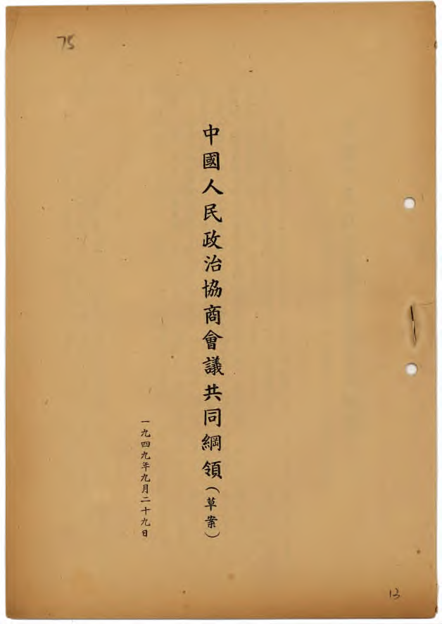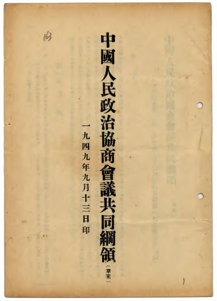 1949年9月17日《中国人民政治协商会议共同纲领》(草案)。该藏品封面题名“中国人民政治协商会议共同纲领(草案)(一九四九年九月十七日印)”,正文为11页装订在一起的铅印稿。