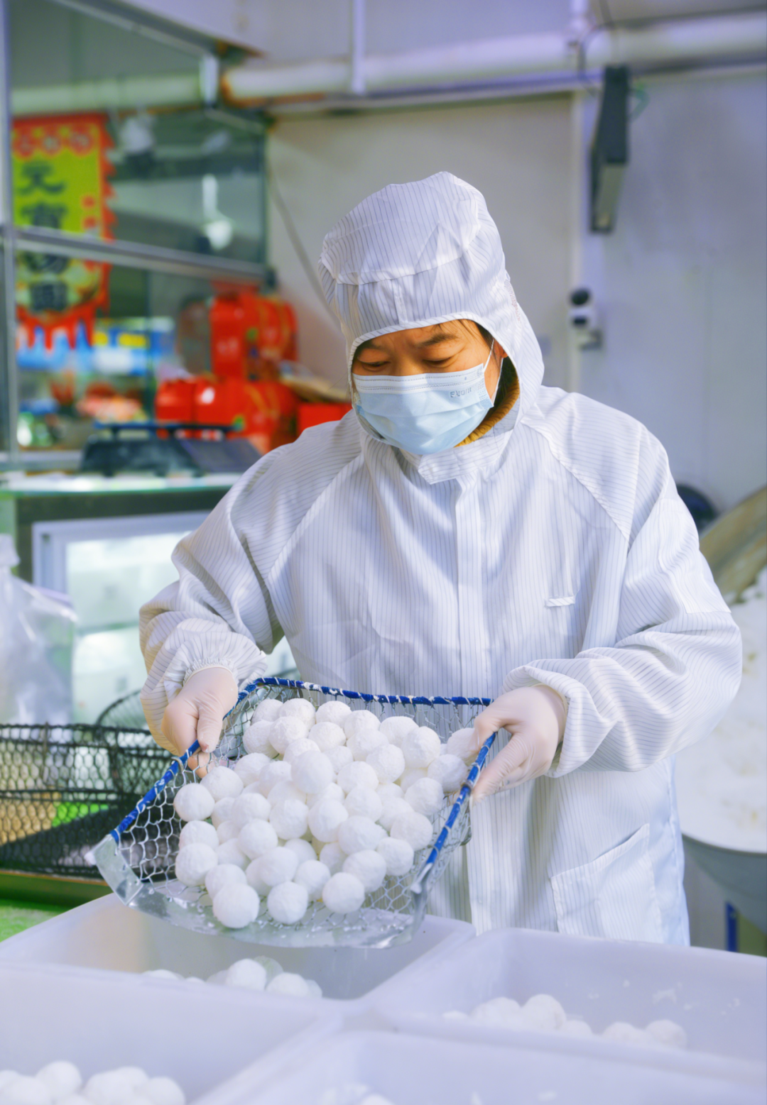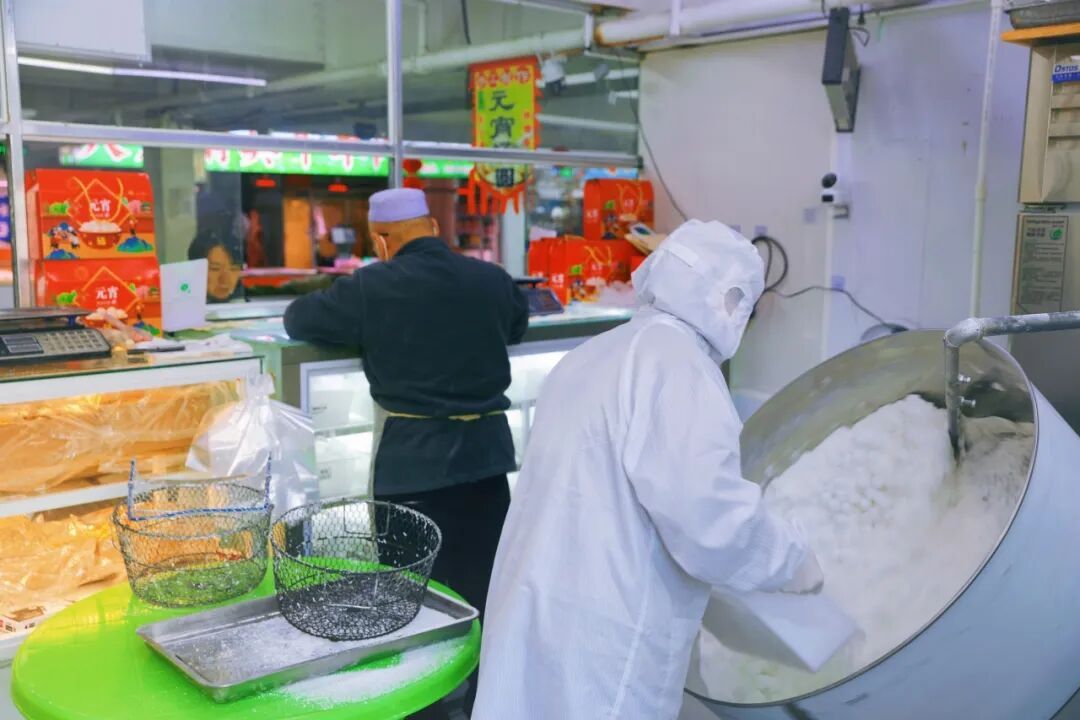 在顺商集团双兴大卖场的外展专区元宵市集,“咚咚咚”的节奏声奏响了节日的序曲。只见师傅将方正的馅料坯投入装有水磨糯米粉的大笊篱中,经过反复翻滚,原本棱角分明的馅料在一次次撞击与裹附中,渐渐“穿”上了厚厚的“白棉袄”,变成了圆润饱满的“白胖子”。