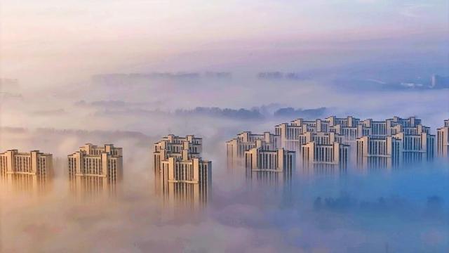 平流雾起,小区的高楼似在云端。