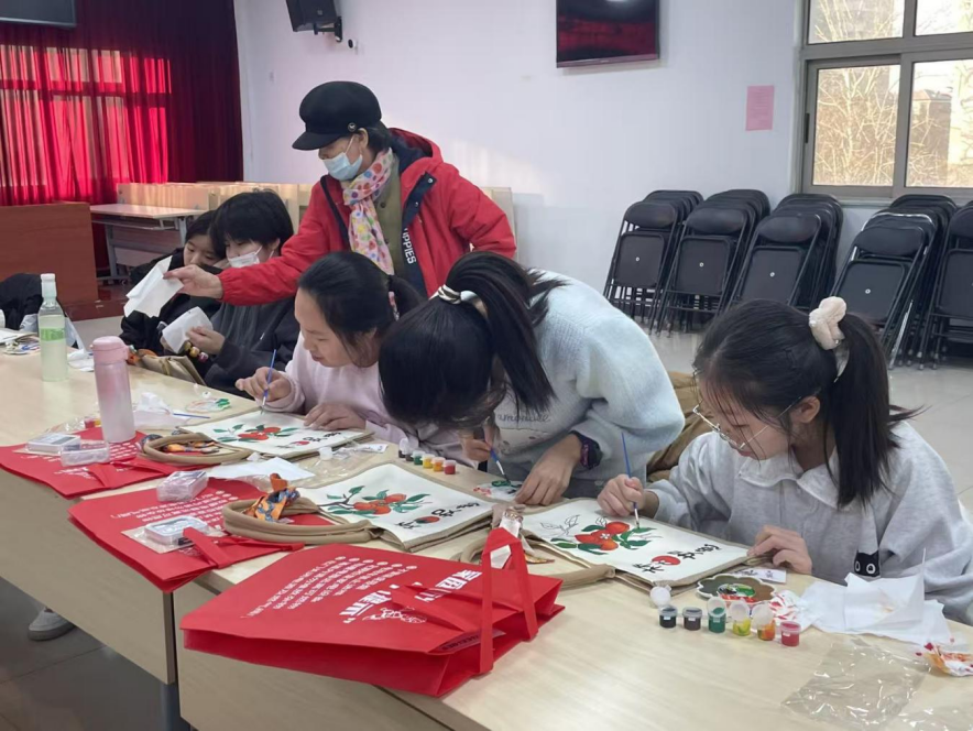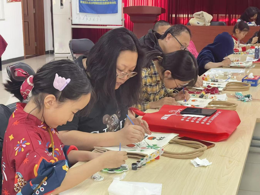 在东安街头条19号院社区,“青青学子·欢聚五里”青少年寒假彩绘帆布包活动同样热闹非凡。社区工作人员刚摆好颜料和帆布包,孩子们就迫不及待地围了上来。“我喜欢柿子,我要画‘柿柿如意’!”孩子们一边挑选颜色一边互相交流着。在志愿者耐心讲解“柿柿如意”的吉祥寓意和彩绘技巧后,大家开始了天马行空的创作。“这里应该用橙色打底,那边留白更好看。”孩子们相互交流着绘画心得。
