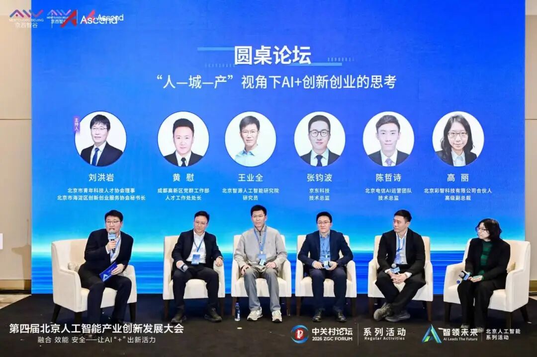论坛汇聚专家学者、企业家、投资人、政府部门代表,通过案例分享、创新路演、圆桌对话等环节,共同探讨人工智能与创新创业的融合路径。智子引擎等企业代表分享了门头沟区“引育用留”人才服务体系、“京西智谷”产业生态,充分展现了热带雨林式创业生态对创新主体的强大吸附力。玛丽·居里学者华人学会、国研能汇、稳准智能、英诺天使等创新团队路演展示了智能制造、AIGC创作、通用大模型等前沿项目,覆盖人工智能、高端制造与金融创投深度融合的多元场景。圆桌论坛环节围绕“人—城—产”与创新创业融合主题,深度探析“人才引领产业、产业支撑城市、城市留住人才”的协同发展路径。