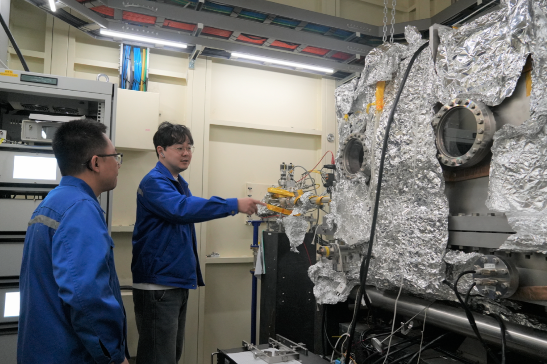 储存环电源厅内,科研人员在电源设备旁研究讨论,检查磁铁温度保护系统的运行状态,确保核心设备安全防护万无一失。