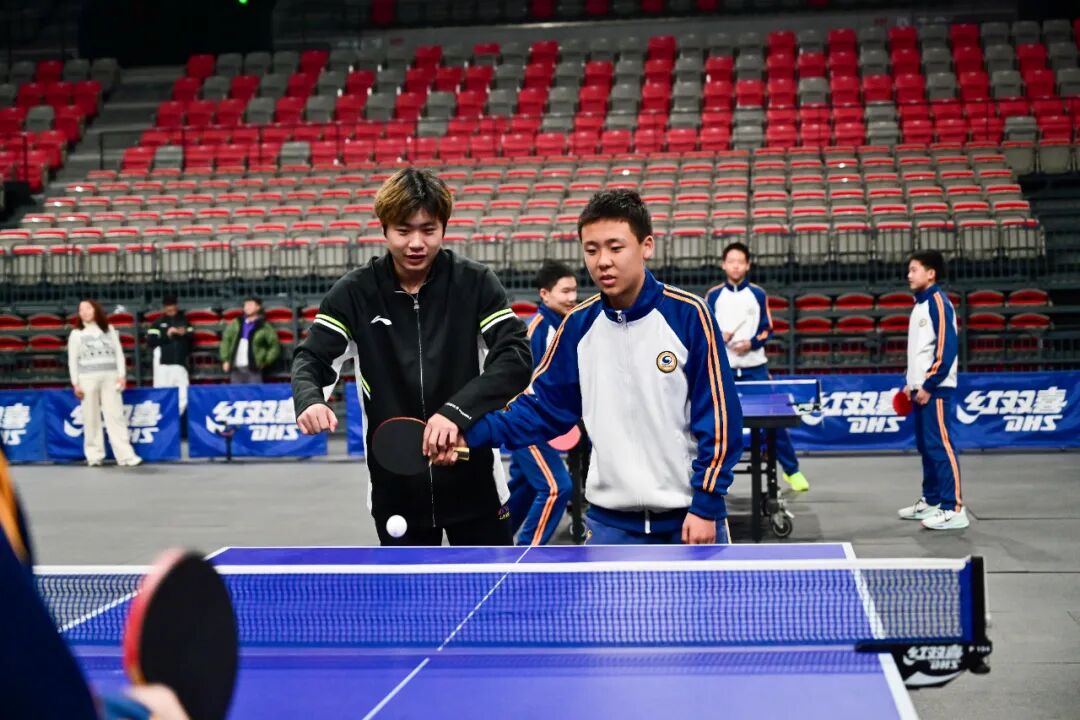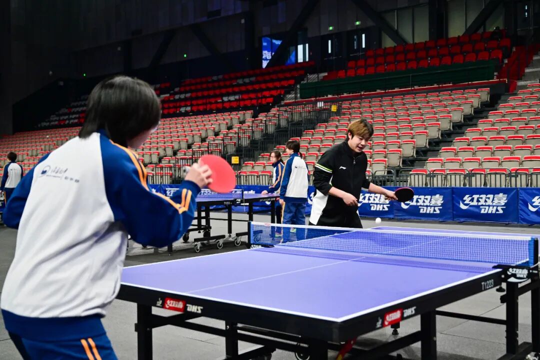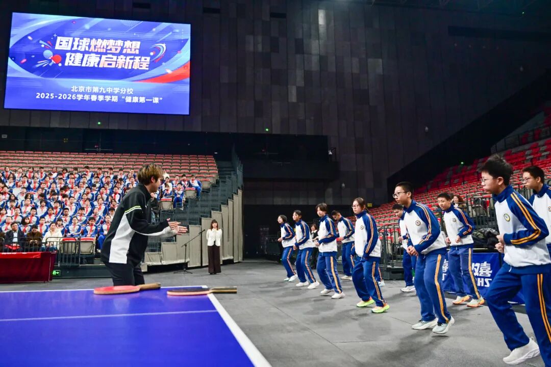 北京市第九中学分校把开学第一课搬进WTT(世界乒乓球职业大联盟)赛事场馆,请来乒乓球世界冠军曹巍当讲师,和学生互动交流、切磋球技。