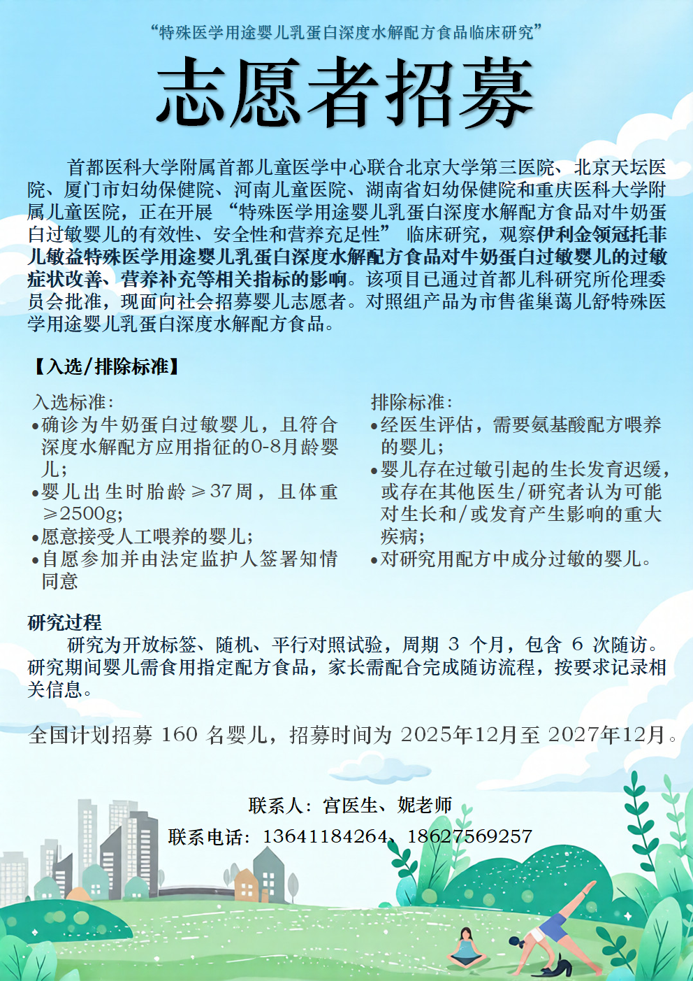 【招募】关于特殊医学用途婴儿乳蛋白深度水解配方食品临床研究志愿者招募