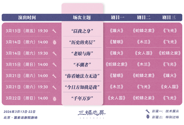 《三妇志异》由三位女性创作者温方伊、陈思安、朱虹璇共同编导完成,对多个神话传说、历史轶事加以全新视角的重构。整部戏的演出包括《木兰》《蛇精之家》《飞光》《女人国》《踵火》《慧眼》六则小戏,每场演出将从中挑选三则,以不同顺序与组合方式上演。
