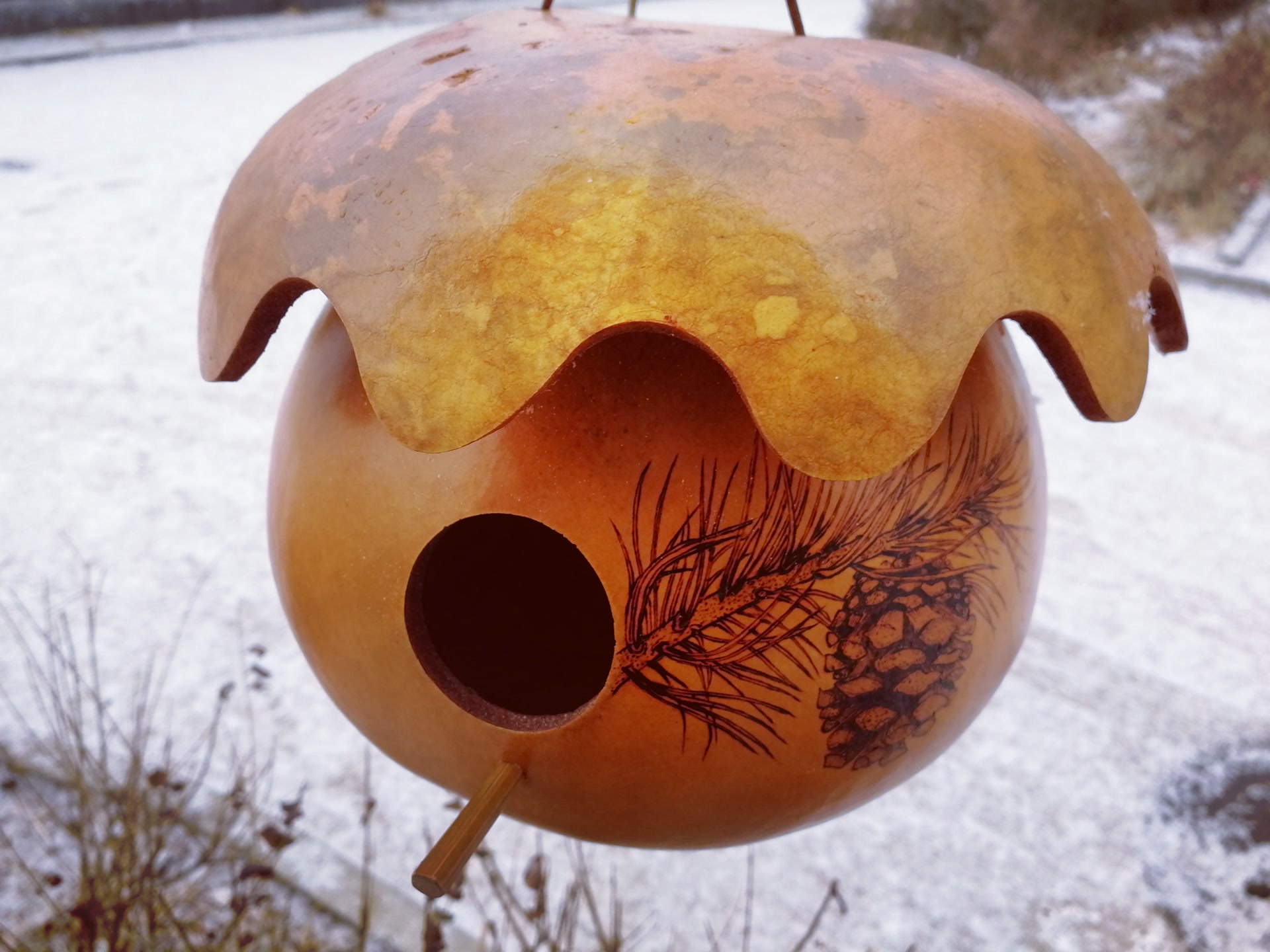 几年前我先后买过几个关禺先生的葫芦,其中包括两个鸟窝,我非常喜欢鸟窝上的纹饰,雪天的时候,我把它挂在小院里,寒冷的冬季存了一瓠的温暖,体量不大,但象征性的暖意弥漫在小院。