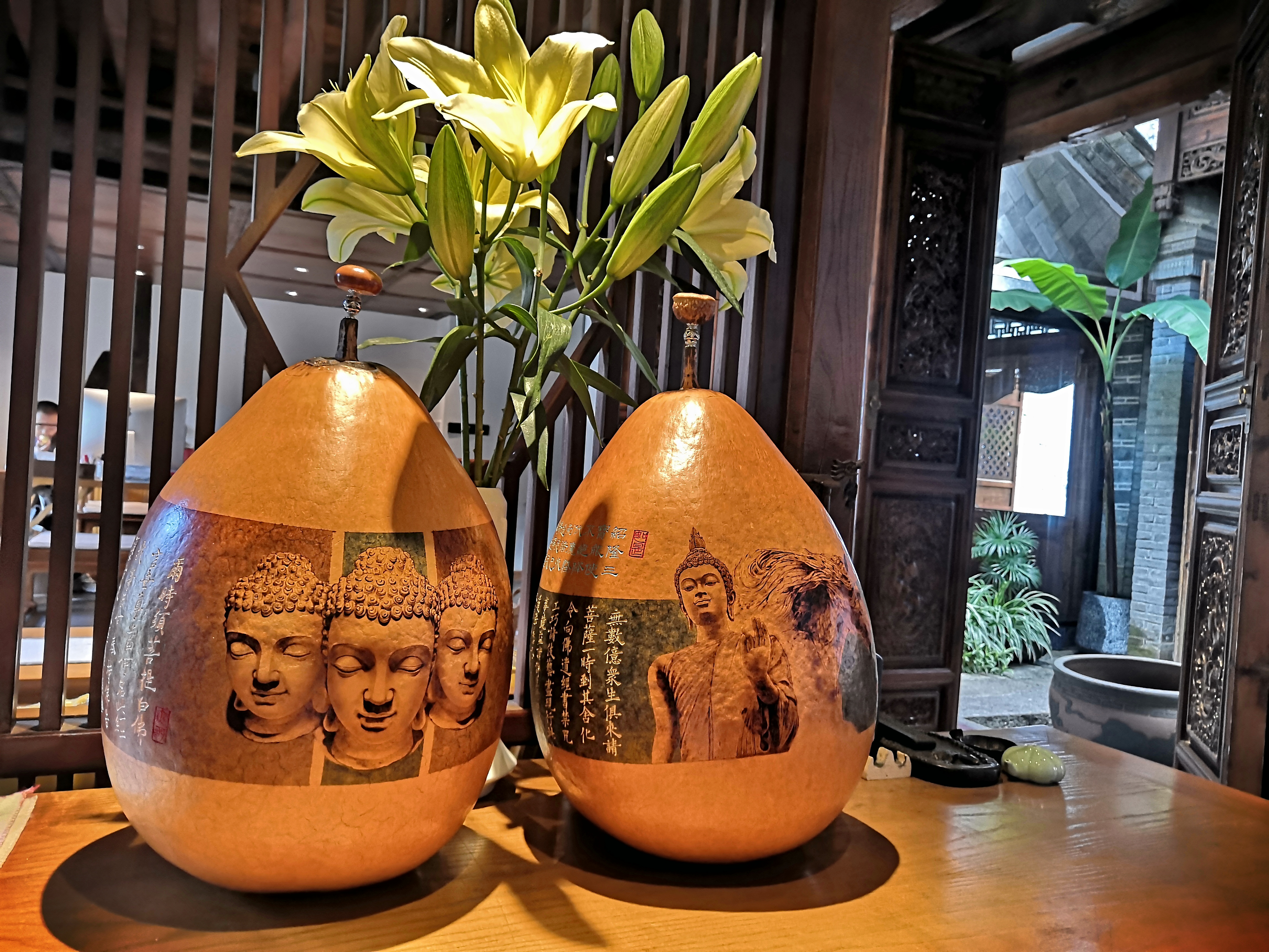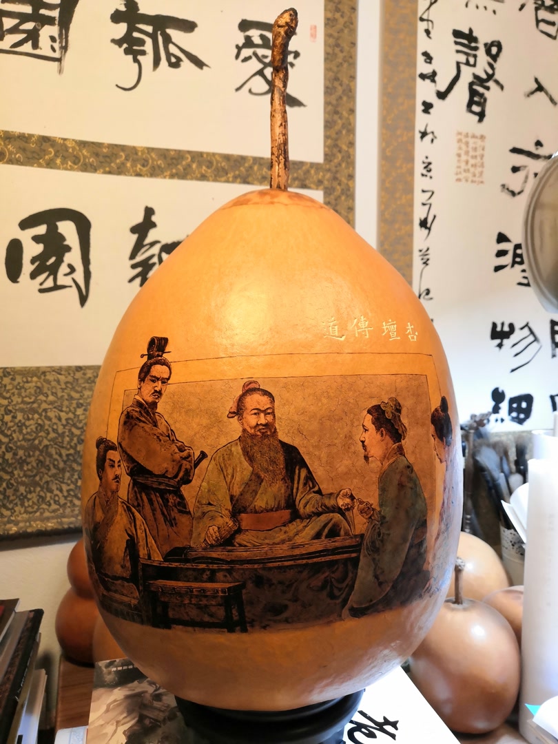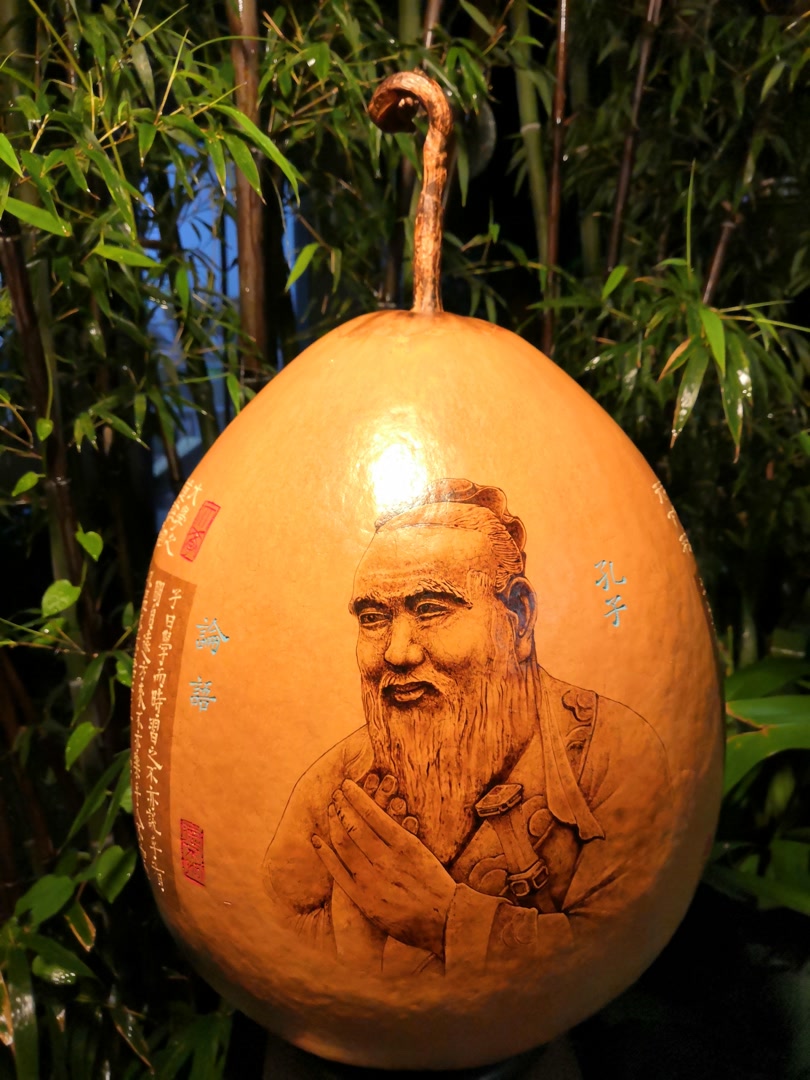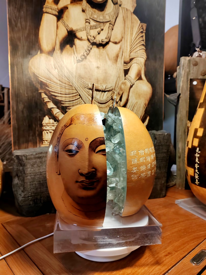每当他创作出新的作品时,会第一时间发给我欣赏,每每看到他独创的匏艺作品,甚是惊讶,仿佛他的世界里有创作不完的内容。