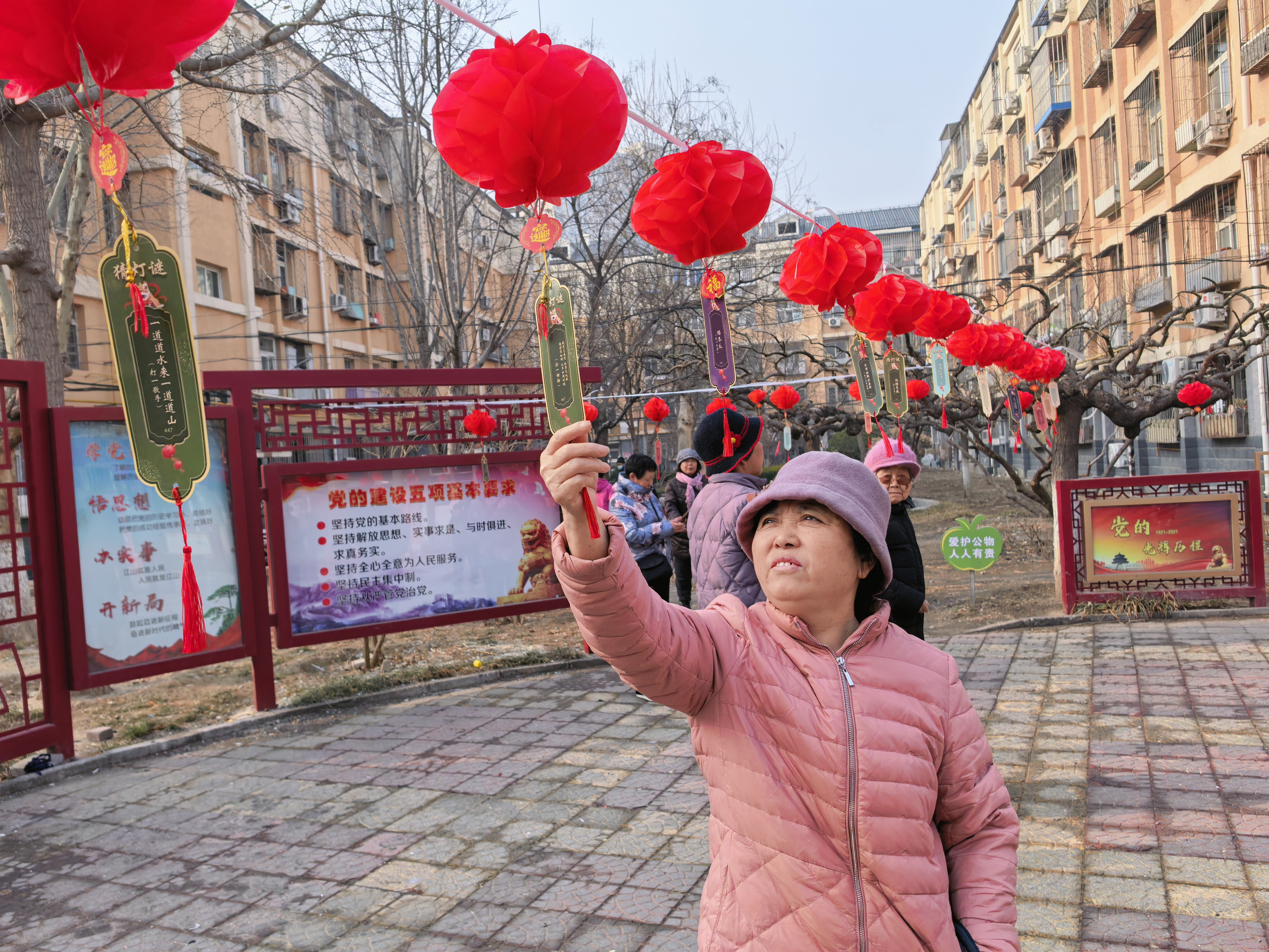 走进活动现场,张灯结彩、热闹非凡的景象扑面而来。红彤彤的灯笼高高挂起,五彩斑斓的灯谜纸条随风摇曳,将整个小广场装点得年味十足。本次灯谜内容经过精心设计,涵盖字谜、成语、民俗常识、生活小窍门等多个类别,难易结合、老少皆宜,既保留了传统文化的韵味,又充分考虑到了老年群体的认知特点,让大家在动脑的同时也能收获乐趣。