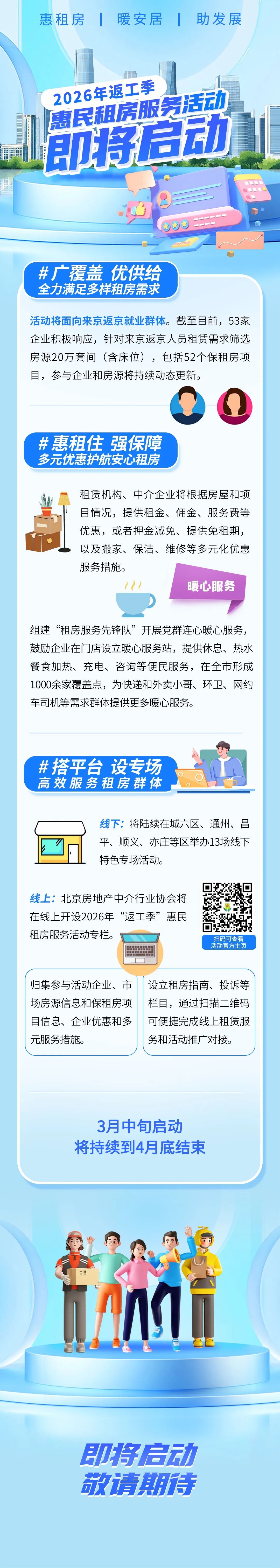 北京市已连续三年组织开展“返工季”惠民租房服务活动。2026年,市住房城乡建设委会同相关部门,指导北京房地产中介行业协会继续按照“党建引领、政府指导、协会主办、企业服务、多方参与、群众受益”的基本原则,聚焦来京返京就业人员住房租赁需求,搭建供需对接服务平台,通过送房源、送优惠、送服务进园区、进企业、进商圈、进招聘会等多样化形式,深化租房供需对接服务,为其提供更多适配优惠房源、多元化暖心服务。