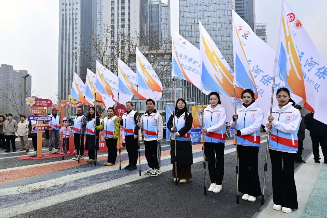 北京城市副中心、天津市武清区、河北省廊坊市大运河保护志愿服务总队及12支街乡镇志愿服务分队授旗成立。