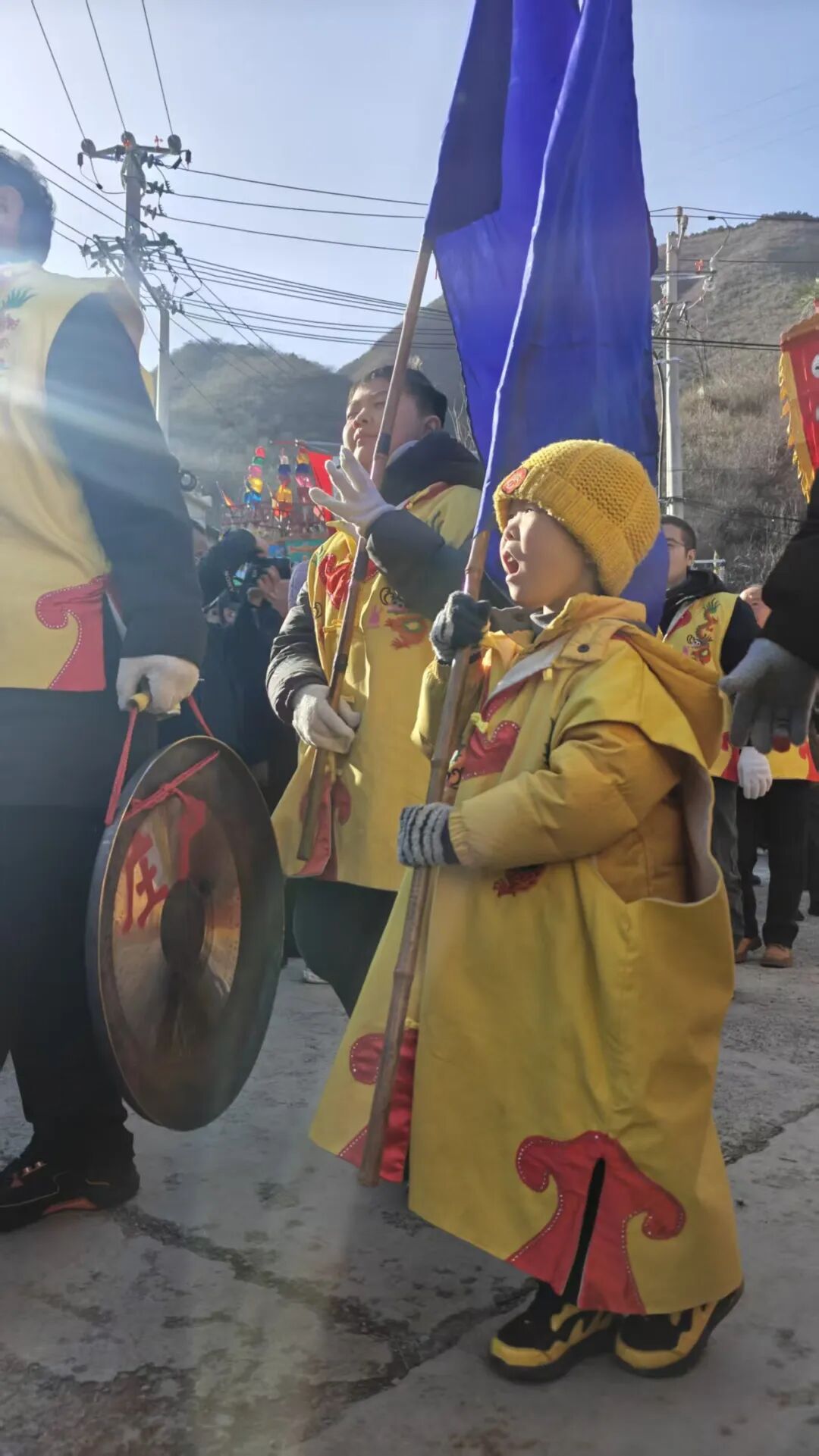 14点30分,随着鸣号响起,幡会正式起会,两村走会迎来高潮。21面幡旗列队成行,10余个会档依次亮相,数百名表演者沿着山间古道巡游行进,场面恢弘壮观。京西古幡乐古韵悠长、气势震天,擎旗、舞幡、小车会等民俗表演轮番登场,勾勒出一幅原汁原味、古朴奔放的京西民俗画卷,赢得现场观众阵阵喝彩。