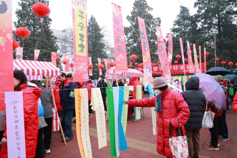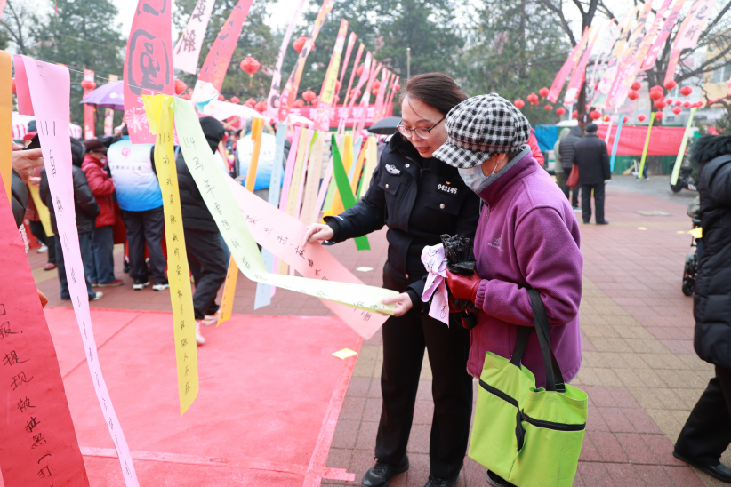 “我知道,谜底是杀猪盘……”灯谜互动区内,600余条手写彩纸灯谜错落悬挂,在红灯笼映衬下年味浓郁。居民们三两成群、围聚探讨,欢声笑语此起彼伏。过程中,片区民警孟文丹还结合灯谜内容,现场开展反诈知识讲解,聚焦当下高发诈骗类型,用通俗易懂的语言拆解作案套路、讲解防范要点,带领大家沉浸式学习反诈知识。