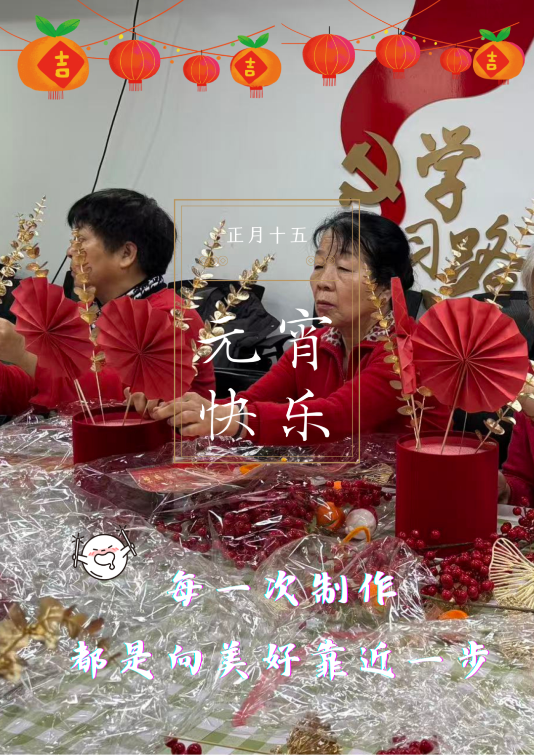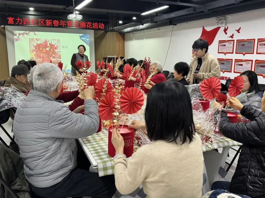 桌上摆满了红彤彤的冬青、金灿灿的银杏叶、寓意吉祥的红色福桶,光是看着就让人心生欢喜。居民们围坐桌前,在花艺老师的指导下,开始动手创作。