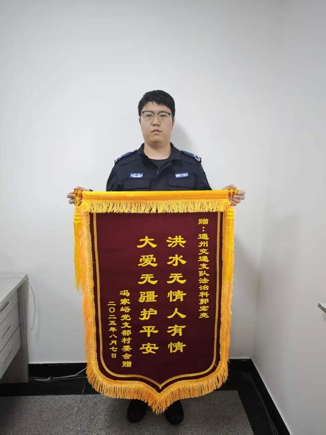 那面锦旗是冯家峪村送来的,去年八月中旬的事儿。村支书带着几个被救的村民,专程从密云赶到通州,把锦旗送到支队门口。锦旗上写着十四个字:“洪水无情人有情,大爱无疆护平安”。