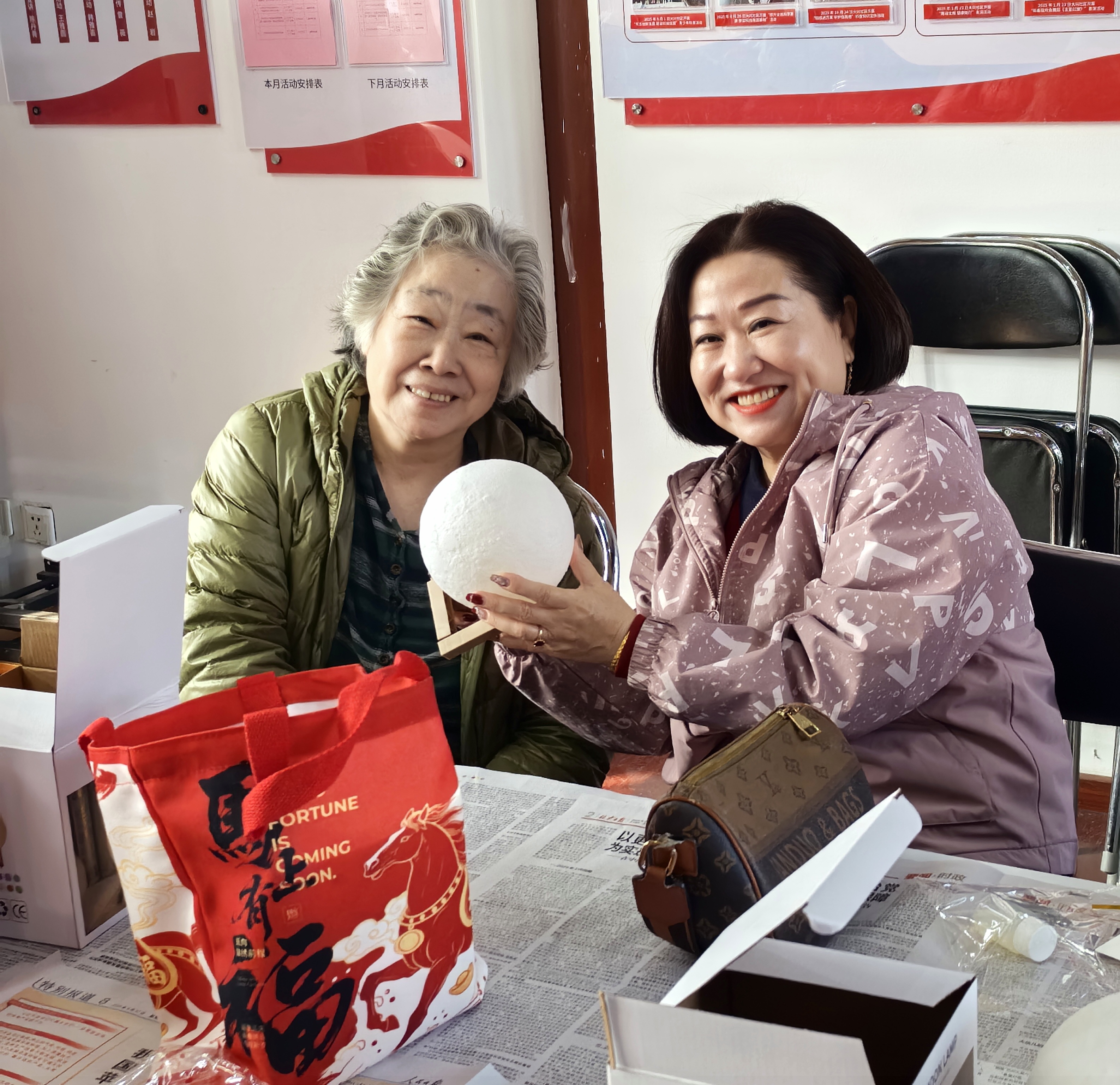 居民们兴致勃勃地拿起贴纸,精心搭配图案,小心翼翼地粘贴在月球灯上,大家互相交流、互帮互助,经过一番精心制作,一盏盏造型别致、温馨浪漫的月球灯逐一完成。点亮灯光,柔和的光晕洒满现场,氛围感拉满。