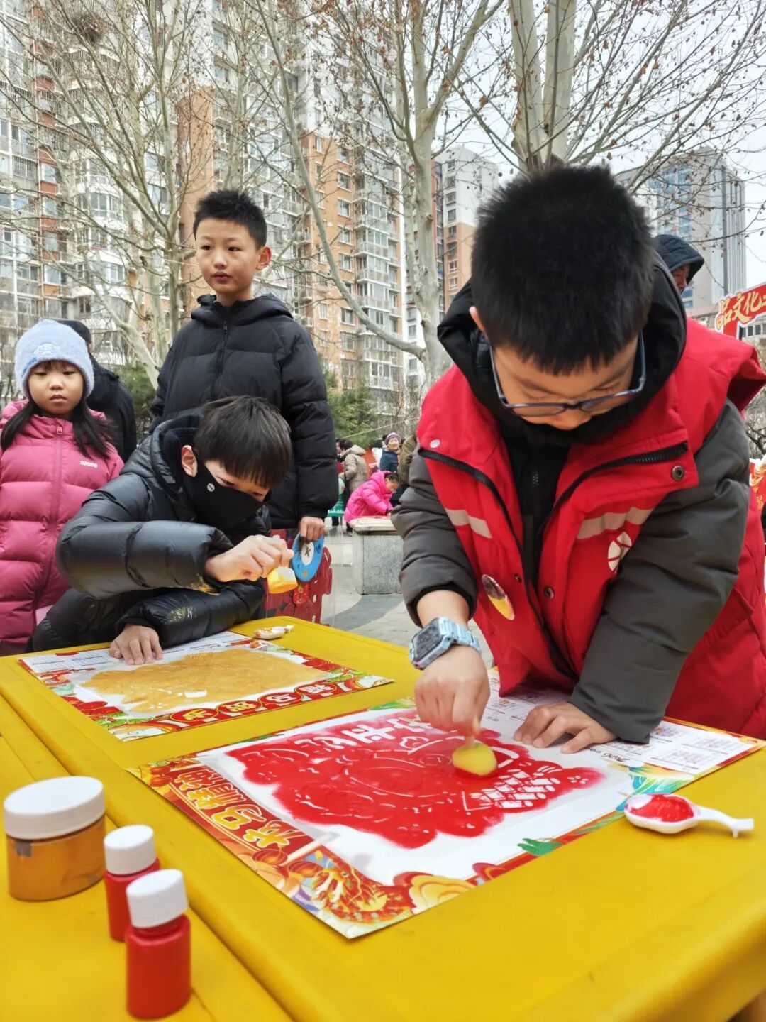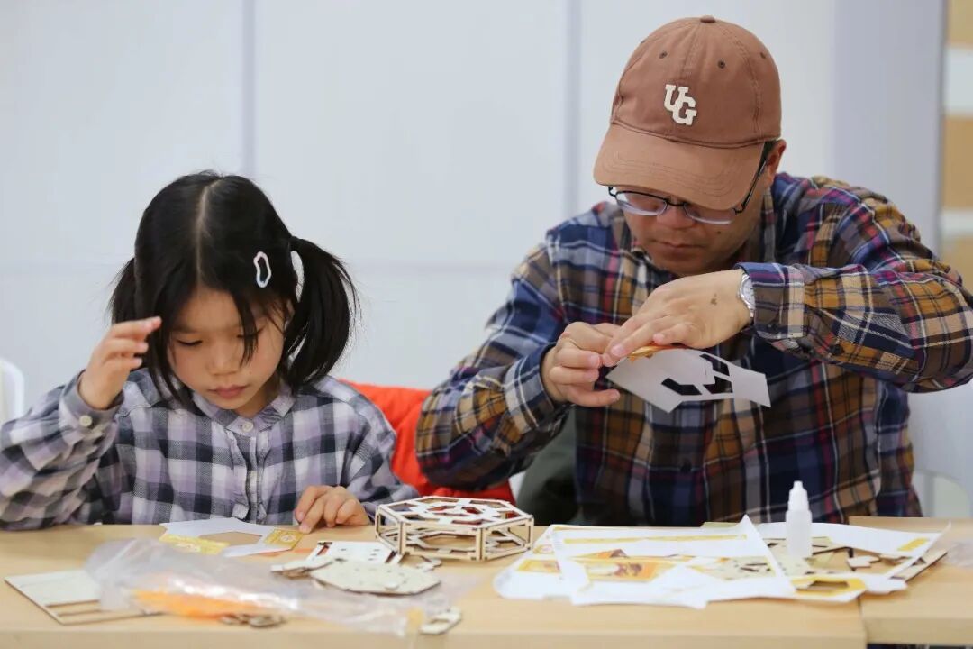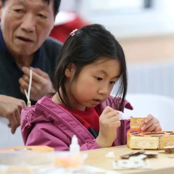 芍药居五社区的公益市集上,孩子们体验非遗拓印马年挂历、为皮影小马上色,零距离触摸千年技艺。