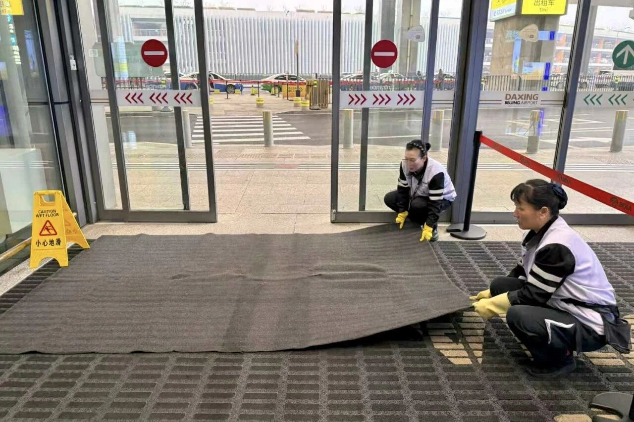 航站楼内,通过广播、线上平台等及时发布天气实况、航班动态等信息,在各主要出入口增设防滑防护设施,并密切关注楼内温度,为旅客营造安全舒适的候机环境。