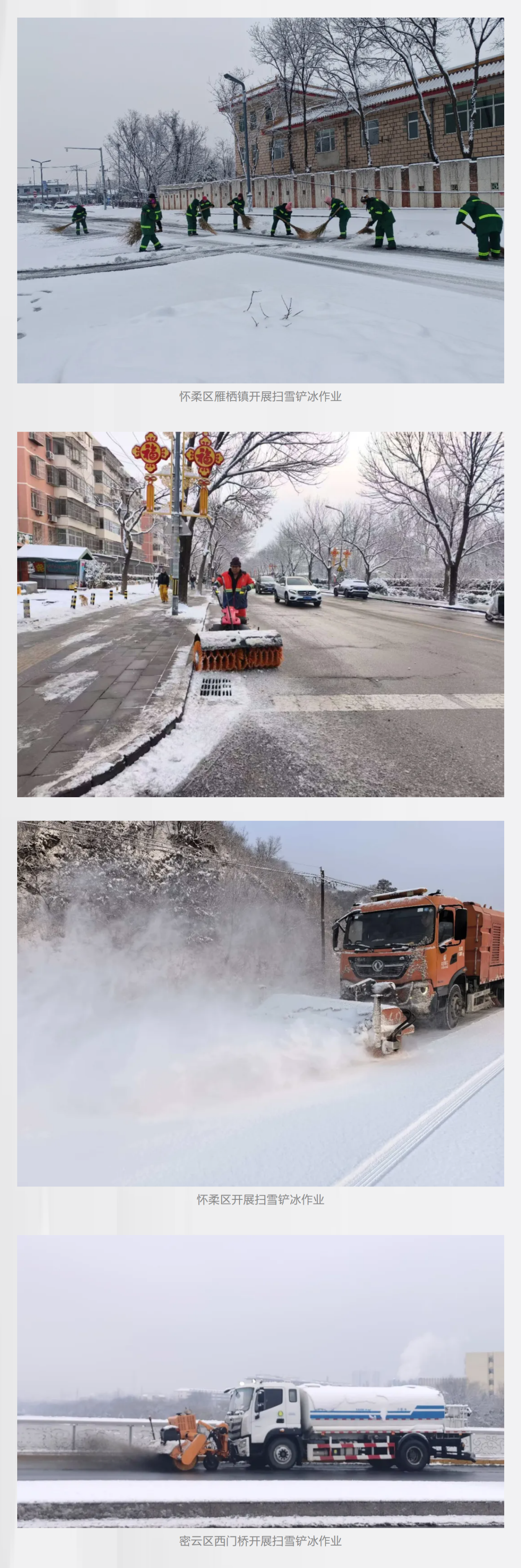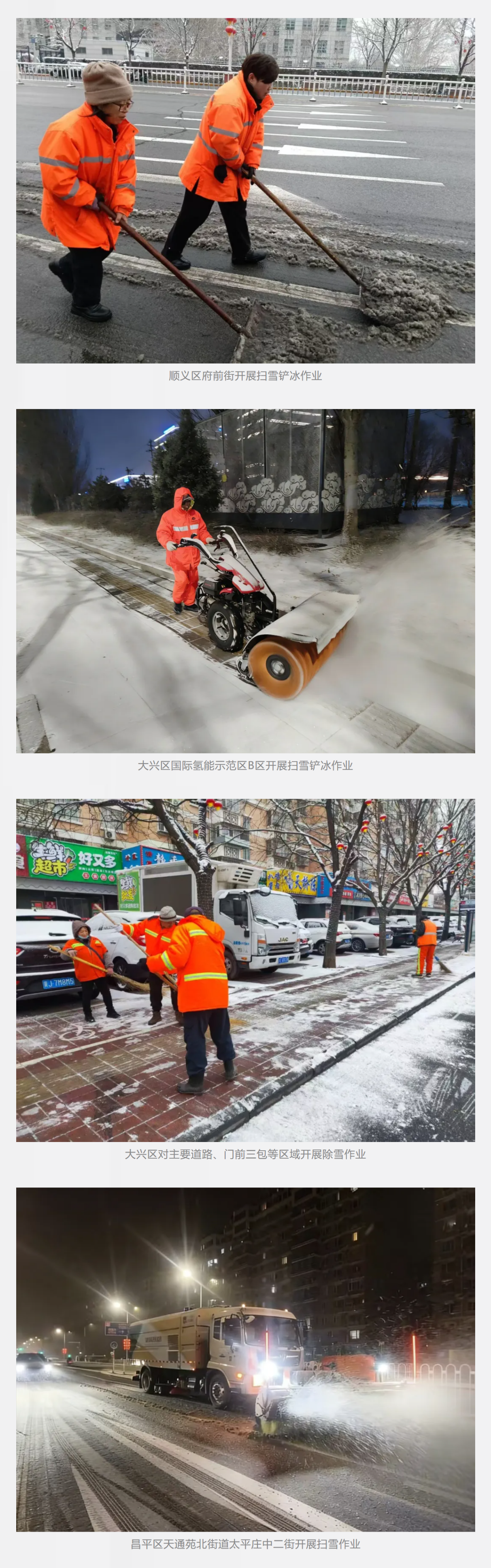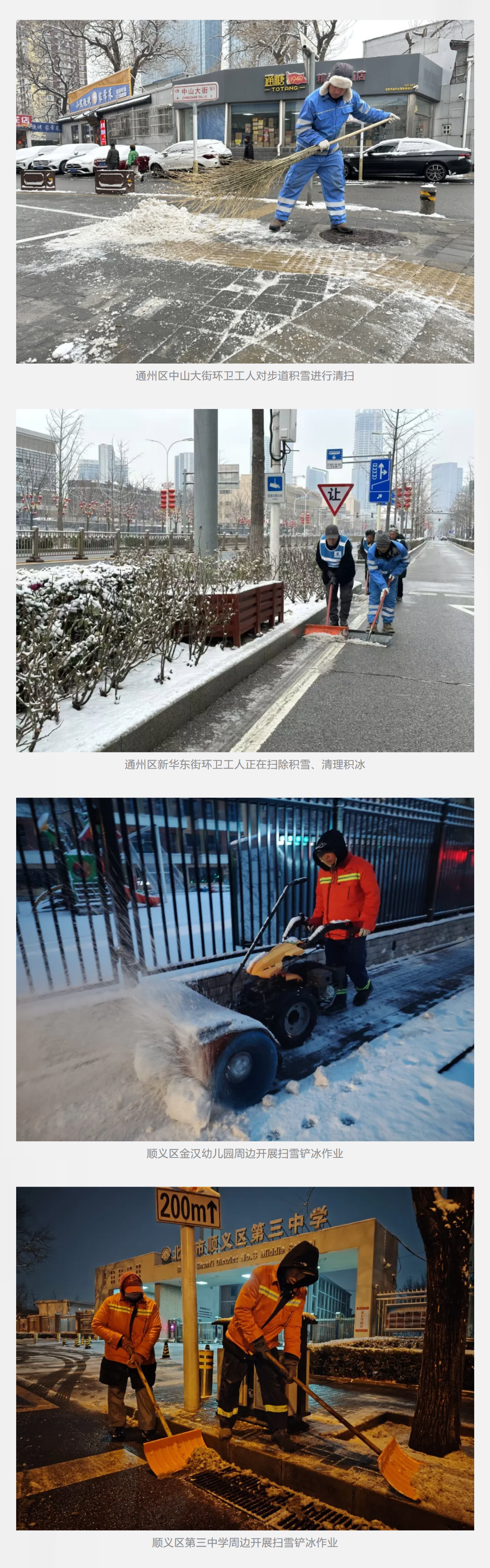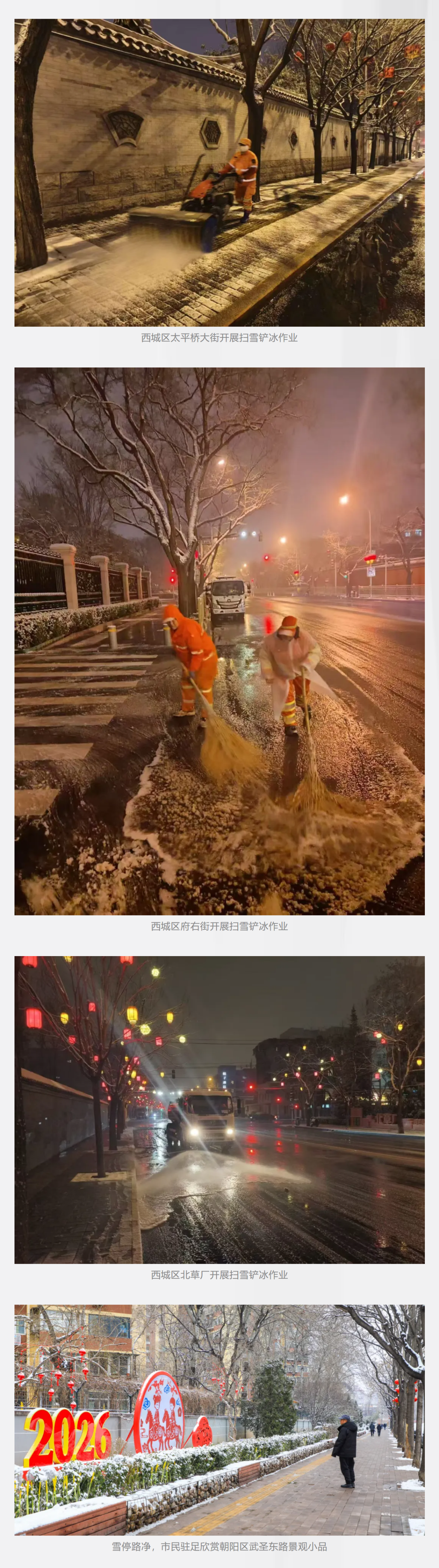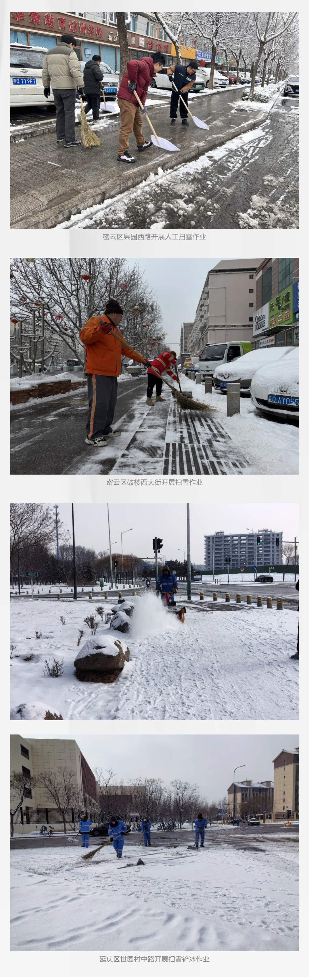 根据路况交通情况,城市道路主次干道采用洗扫车或者滚刷巡回作业,做到“雪中路畅”。背街小巷、农村街坊路等以日常清扫保洁作业单位为主,采取人工或机械设备除雪。在保障通行的同时,兼顾市民赏雪需求,公园广场、小区、单位院内等区域按“宜留则留、宜扫则扫”原则清理积雪,让市民获得更舒适的赏雪体验。