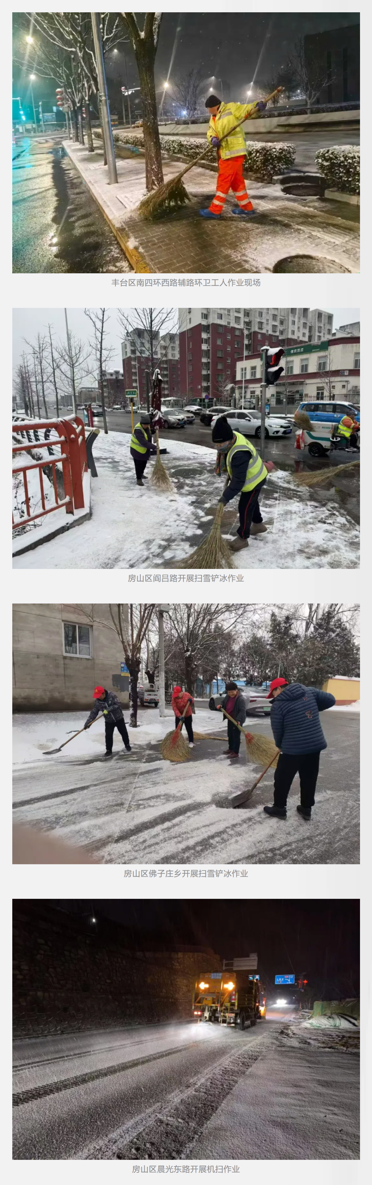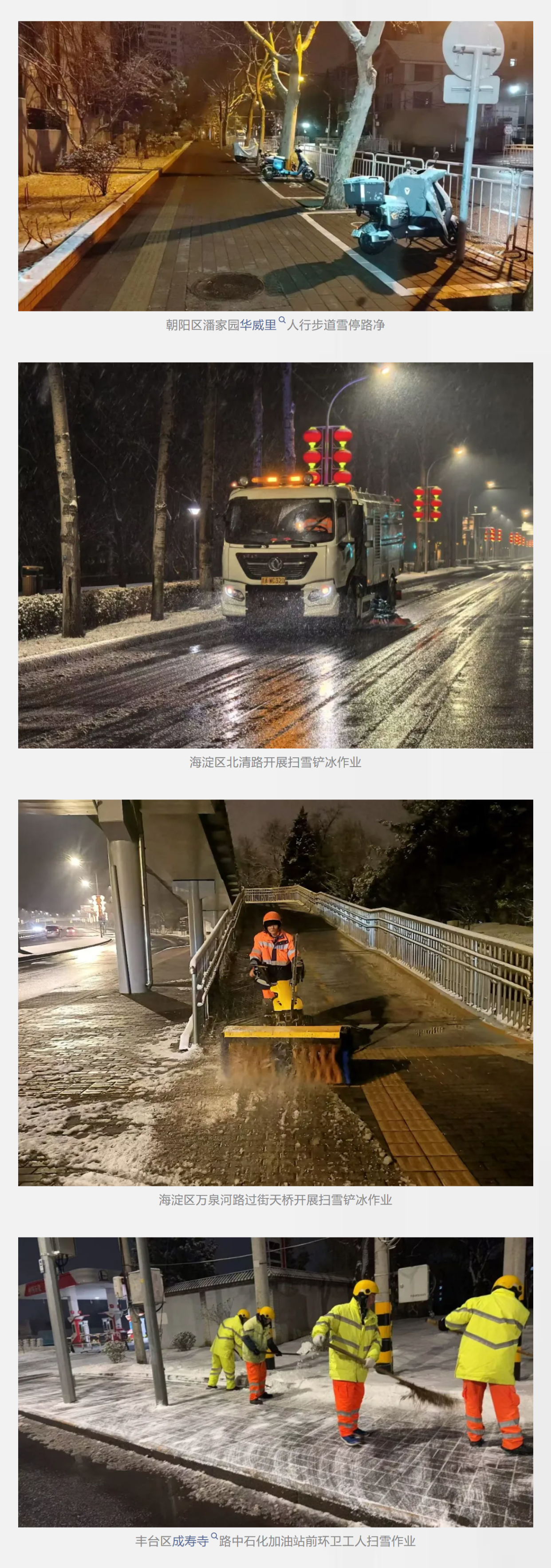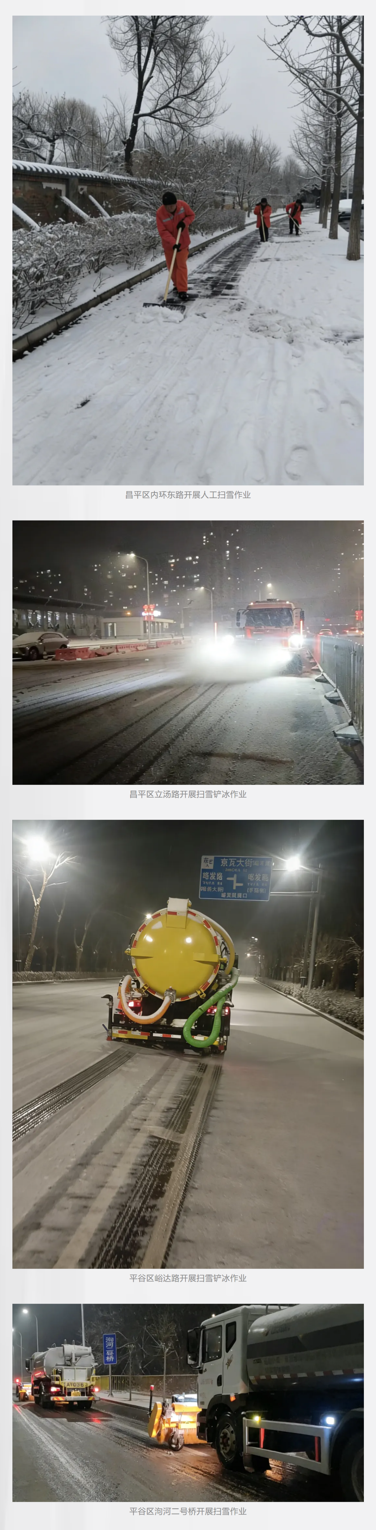 全市各作业单位提前前置备勤,作业车辆设备在降雪前抵达指定点位,巡查人员同步开展路面降雪巡查和温度监测,实现雪下即扫、随下随扫。