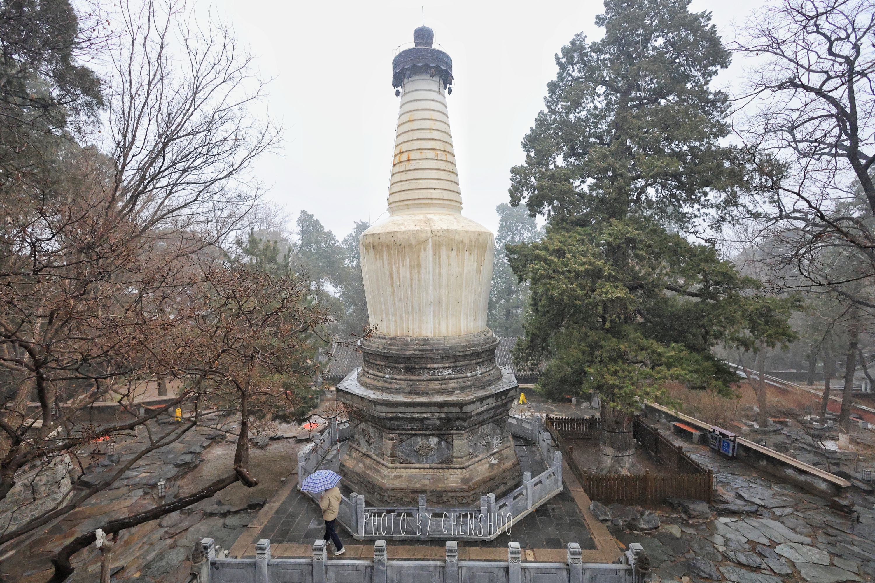 漫步寺中,目之所及皆是清绝。苍劲古松托着蓬松积雪,虬枝横斜,风骨凛然;翠竹凝雪,绿白相映,清冽又温润;白塔静立山间,素雪覆身,古朴庄严,与苍松相映,自成一方禅境。