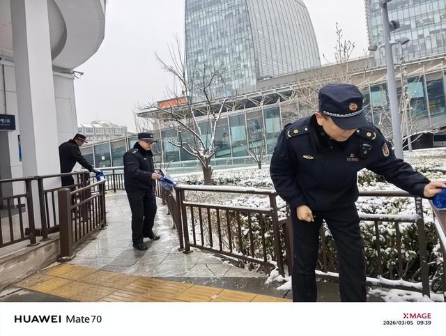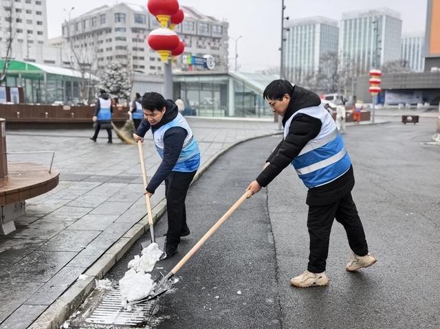 随后,志愿者们分组行动,有序开展环境清洁、文明宣传、秩序维护等服务:规范共享单车停放、清理广场卫生、帮扶重点旅客,发放文明出行宣传资料,将奉献精神融入站区治理的每一个细节;扫雪铲冰队伍手持工具,不畏严寒、分工协作,清理广场出入口、人行通道的积雪积冰,全力消除出行安全隐患,为旅客市民开辟出一条安全畅通的“暖心路”。