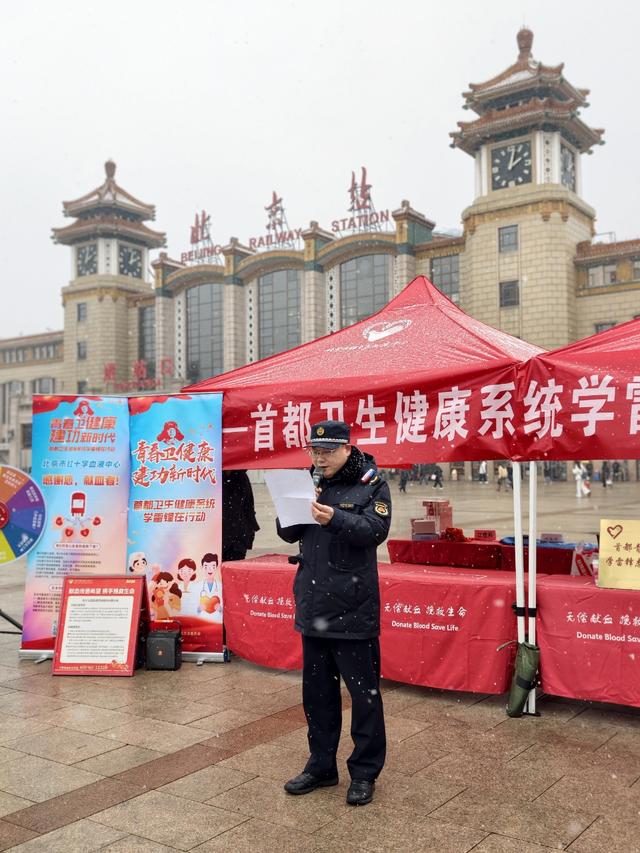 北京站作为首都重要交通枢纽,日均客流密集,是展示城市文明的重要窗口。本次活动将健康服务与公益宣传送到旅客身边,让南来北往的出行者在旅途之中感受暖心关怀。活动现场设置义诊咨询区、无偿献血科普区、健康宣教区与便民服务区,来自医疗机构的专业医师与血液中心志愿者并肩值守,为过往旅客、周边市民及站区一线工作人员提供全方位健康服务。