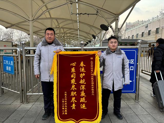 2月27日,一位经常来南广场调度站运营的出租车司机韩师傅,专程将一面绣有“春运护航深夜疏运 心系司乘尽职尽责”的锦旗送到调度站,特别点名感谢班长杨兵:“杨班长真是咱们司机的贴心人!我天天在南广场拉活,天天都能看到杨班长。除夕夜那么冷,他端着热腾腾的饺子,一个一个送到我们手里,那热乎劲儿,到现在心里都暖!”