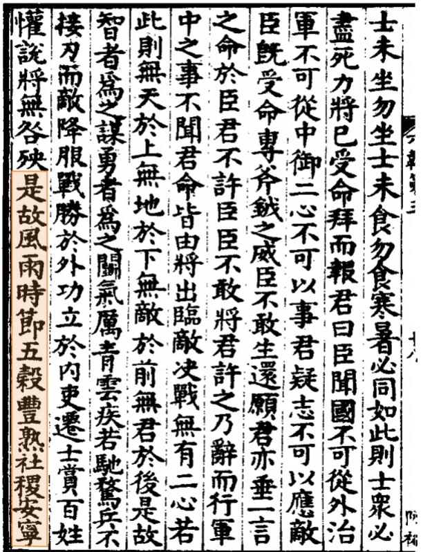 是故风雨时节[1],五谷[2]丰登,社稷[3]安宁。——《六韬・龙韬・立将》[4]