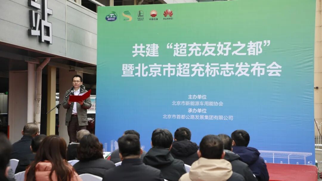 活动现场,为“北京超充”标志揭幕;北京市新能源车用能协会为标识征集活动获奖作者代表颁发获奖证书。来自首发集团、中国石化北京公司、中国石油北京公司、国网北京公司、华为公司等多家单位的代表共同见证标识发布。