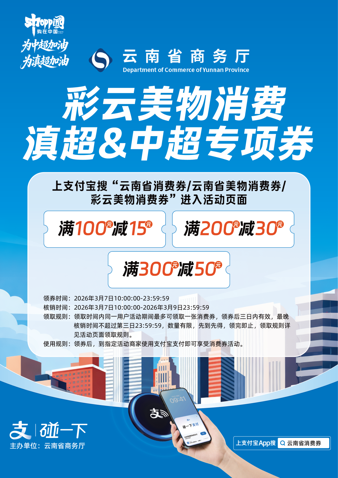 彩云美物消费滇超&中超专项券分四轮发放,具体发放时间分别为2026年3月7日10:00:00—23:59:59、3月14日10:00:00—23:59:59、3月21日10:00:00—23:59:59、3月28日10:00:00—23:59:59。数量有限,先到先得,领完即止。