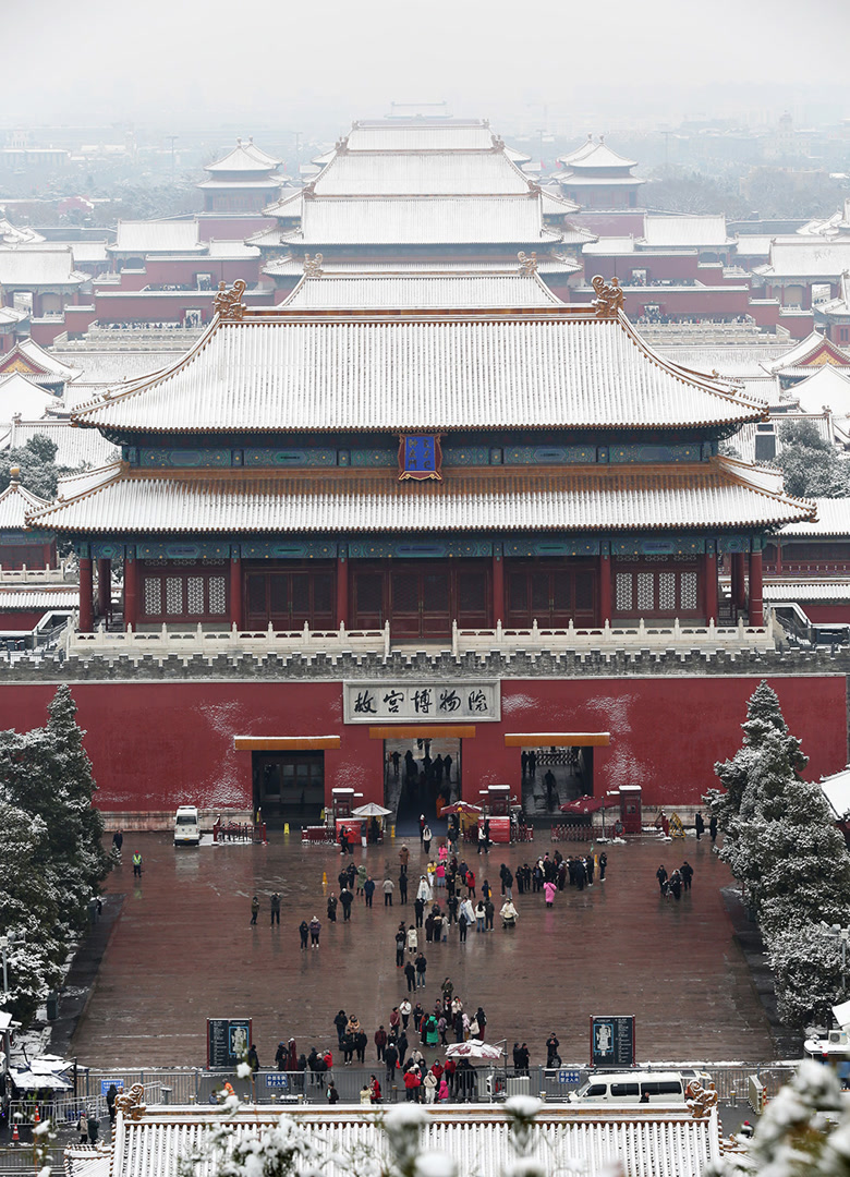 站在万春亭前,从“北京中轴线”标志护栏前向南望去——故宫宫殿群、端门、天安门、前门,一路铺陈开去,琉璃瓦上覆盖着新雪,薄薄的一层,却让整座城安静了下来。神武门两侧的红墙,在素白中愈发沉静、醒目。