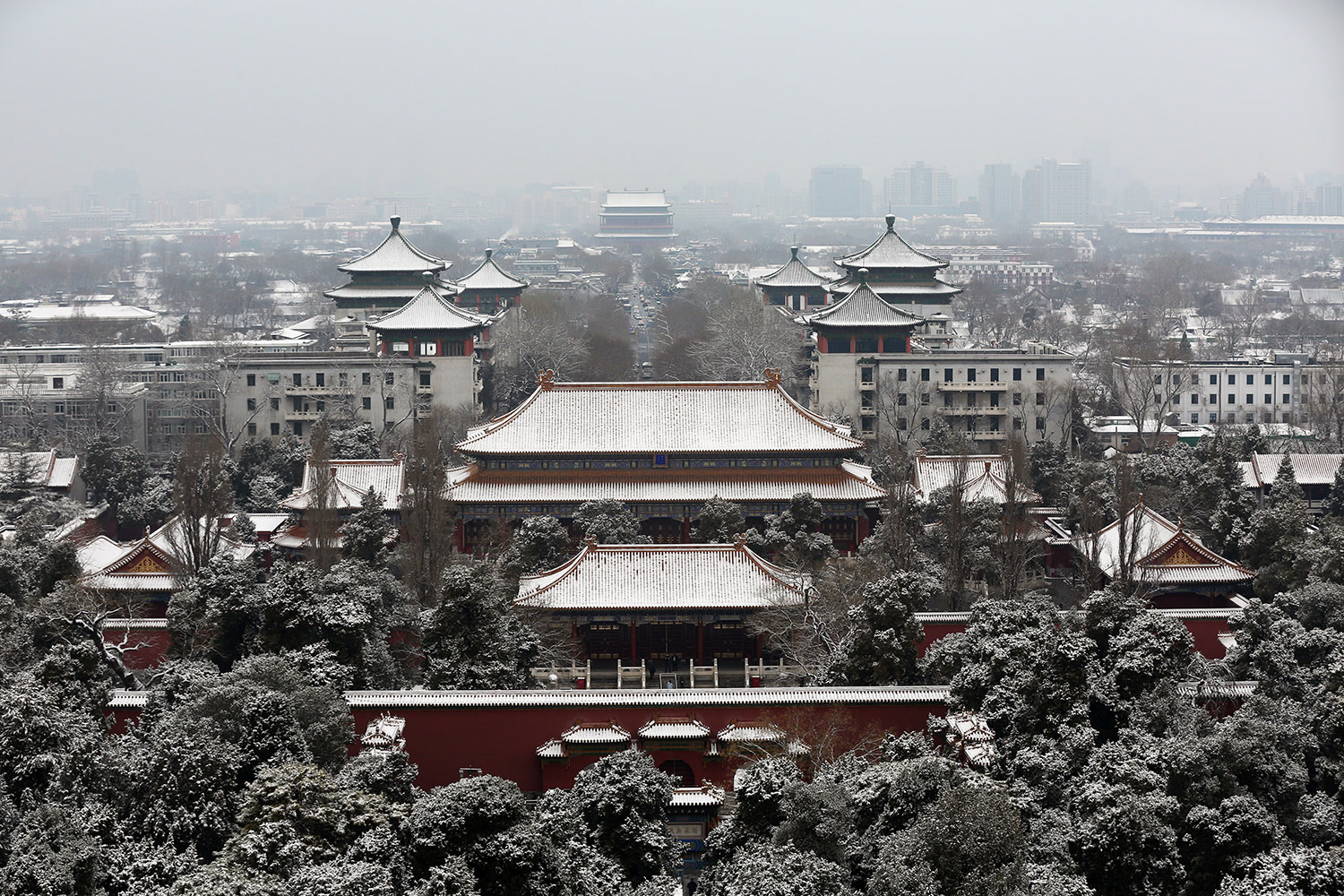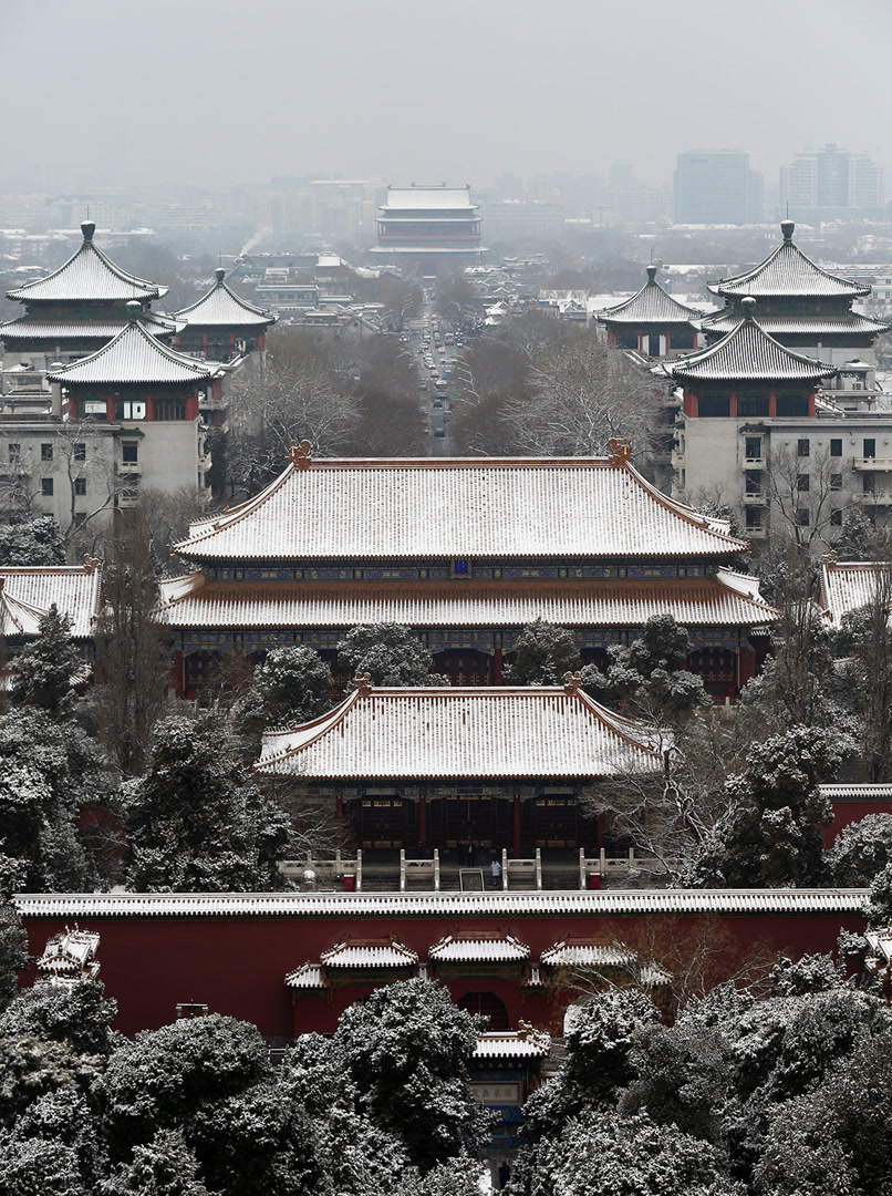 2026年3月5日,从北京市东城区景山山顶俯瞰雪后北京中轴线北端景色(作者摄)