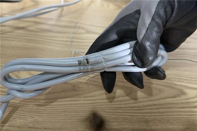 在温度达到217.2℃时,捆成一团的电线突然发出爆响声,并在接触部位发生打火现象,电线绝缘保护层破损、导线裸露。