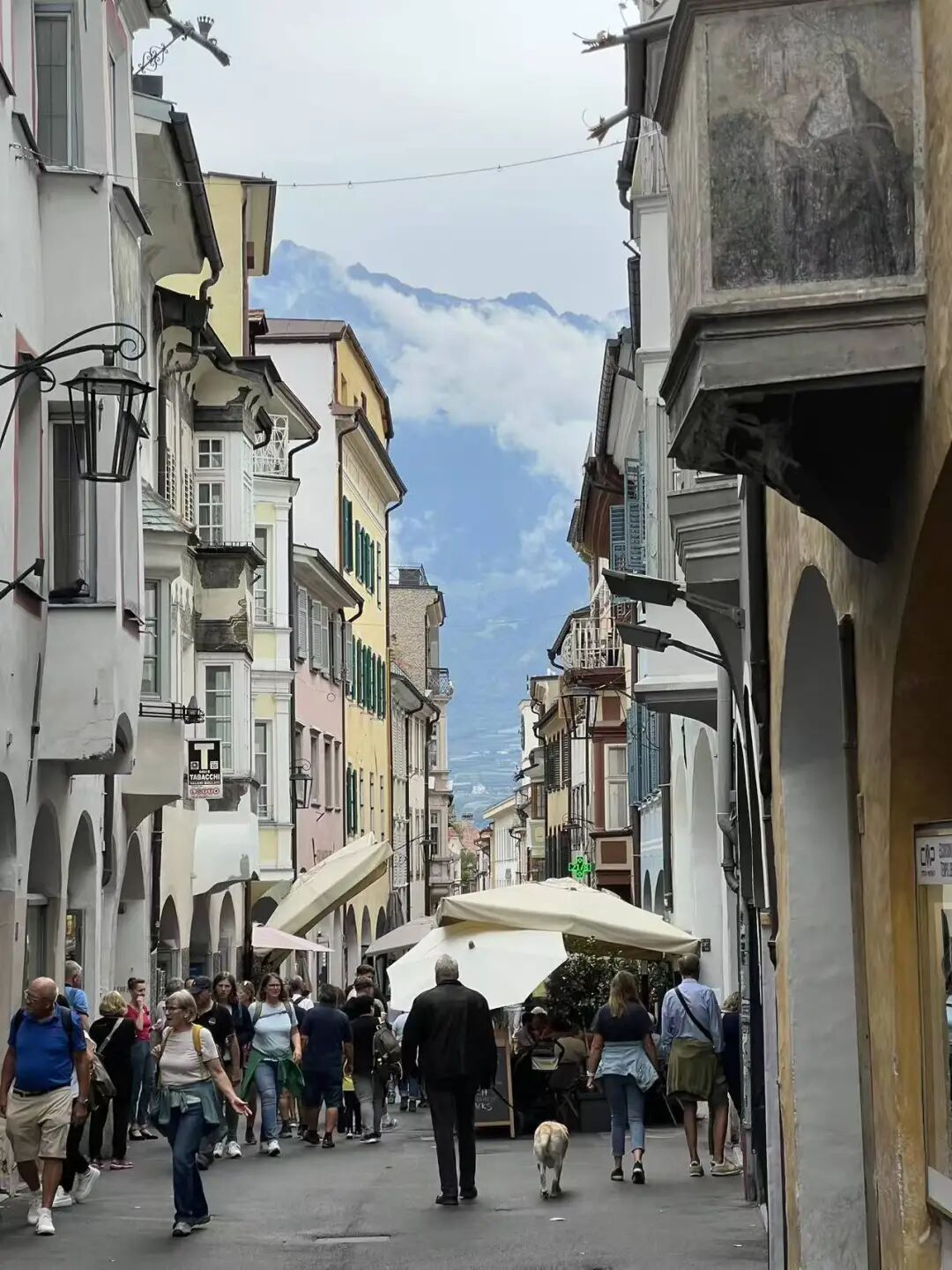 大巴以不可思议的平稳在群山间穿行,当我们抵达时,写着“Meran/Merano”的路牌宛如从天而降。熙熙攘攘的游客们大多说德语——明明是在意大利境内,德语却稳稳占据着路牌的第一行。倒也不奇怪,毕竟哈布斯堡家族在此统治了六个世纪,直到“一战”前这里还属于奥匈帝国。
