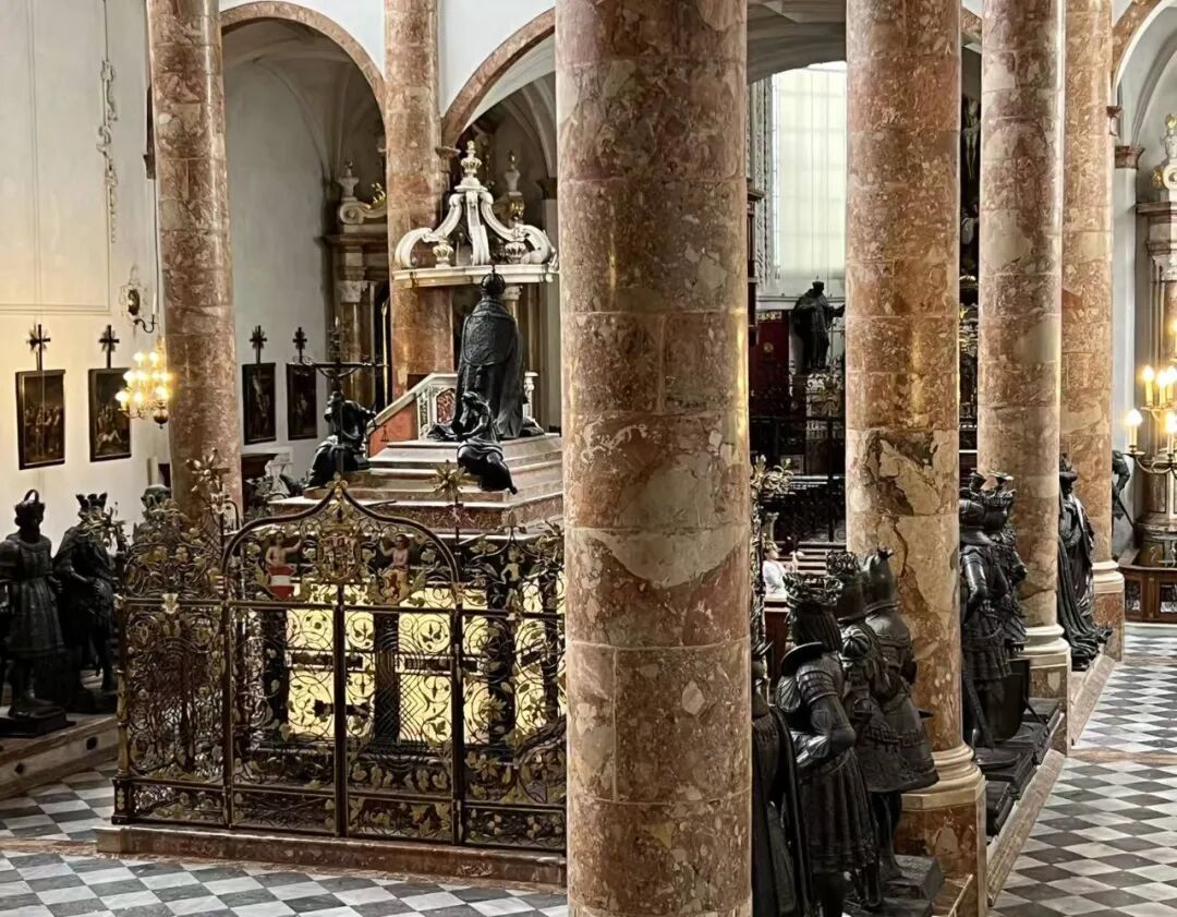 踏入老城街巷,我进入宫廷教堂,探访马克西米利安一世的陵墓。巨大的棺椁安放在教堂中心,四周肃立着28尊栩栩如生的黑色铜像,静默守护。这些不朽的铸像象征着永恒的英雄,他们中有哈布斯堡家族的先祖、忠诚的盟友,以及亚瑟王这类传奇帝王。布永的戈弗雷与伟大的狄奥多里克亦位列其中——哈布斯堡帝国的政治版图由他们拱卫,而因斯布鲁克正是这片版图的核心。这一幕,庄重地诉说着帝国昔日的尊荣与权威。