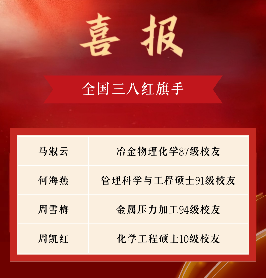 近日,2025年度全国三八红旗手标兵、全国三八红旗手、全国三八红旗集体、全国巾帼文明岗名单公布。据公开新闻报道,有四位学校校友名列其中。