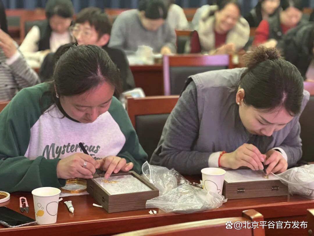 市规划自然资源委平谷分局举办了“实干开新局 匠心筑芳华”掐丝珐琅首饰盒手工制作活动,传承非遗匠心。专业老师现场讲解技艺渊源和制作技巧,女职工们从设计、掐丝成型到点蓝、固色,精雕细琢,让牡丹花、茶花、山水在盒面绚丽绽放。