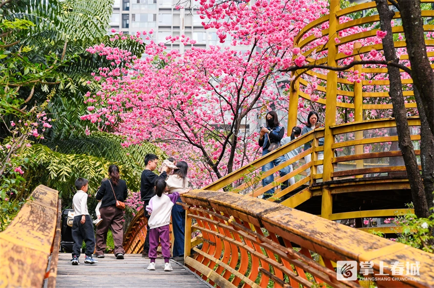 步入园区,百余株樱花次第盛放,粉白相间、如云似霞,春风拂过,花瓣轻舞飞扬,勾勒出春城独有的浪漫景致。在银海樱花语、荷塘月色小区内,红色彩虹桥与粉色樱花相映成趣,成为园区最佳拍照打卡点;杜鹃花与樱花竞相绽放、姹紫嫣红,一步一景,美不胜收。为让居民尽享游园乐趣,活动现场精心设置了赏花步道、主题打卡点、樱花市集、互动游戏与休憩空间,方便居民漫步赏樱、拍照留念,在沁人花香中感受自然之美与生活暖意,让居民在家门口即可邂逅春日盛景。