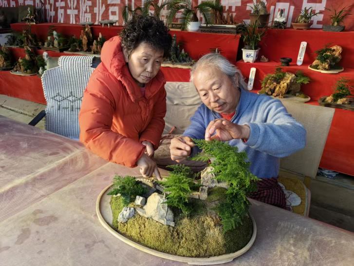 丛小华夫妇在精心打理培育“丛氏好心情”云竹盆景。