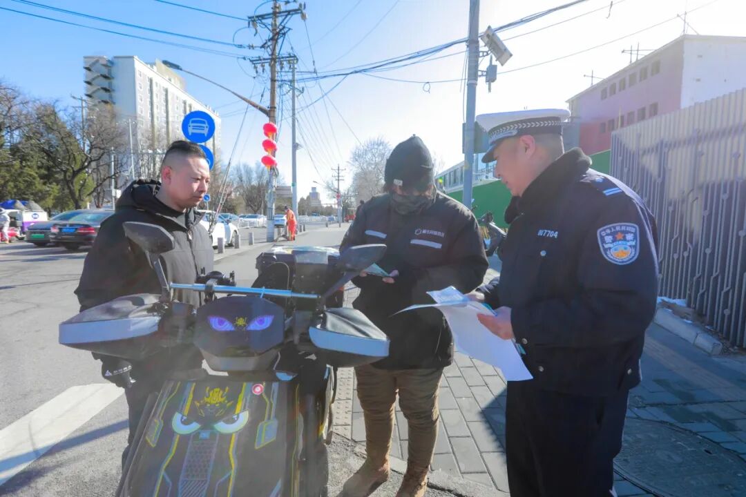 新修订的《北京市非机动车管理条例》将于2026年5月1日起施行,此次宣传活动以此为契机,重点向骑行者普及新规内容。工作人员对在人行道骑行、不佩戴头盔等违法行为进行现场纠正与处罚,以规范交通秩序,保障出行安全。通过展板现场展示,发放宣传折页、手册等方式,吸引了众多市民驻足观看和咨询。