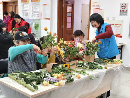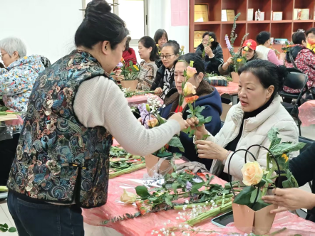 社区工作人员精心布置了活动场地,玫瑰、康乃馨、洋桔梗等各色花材馥郁芬芳。花艺老师从花材选择、色彩搭配到造型设计进行详细讲解,带领大家走进唯美的花艺世界。讲解过后,大家迫不及待地动手创作起来,修剪枝叶、搭配色彩、构思造型,每一个步骤都倾注了专注与巧思。经过一个多小时的精心制作,一束束错落有致、生机盎然的插花作品跃然眼前,大家手捧作品合影留念,记录下这美好的春日瞬间。活动不仅让女性居民在花香中放松了身心,更通过艺术创作展现了新时代女性热爱生活、积极向上的精神风貌。