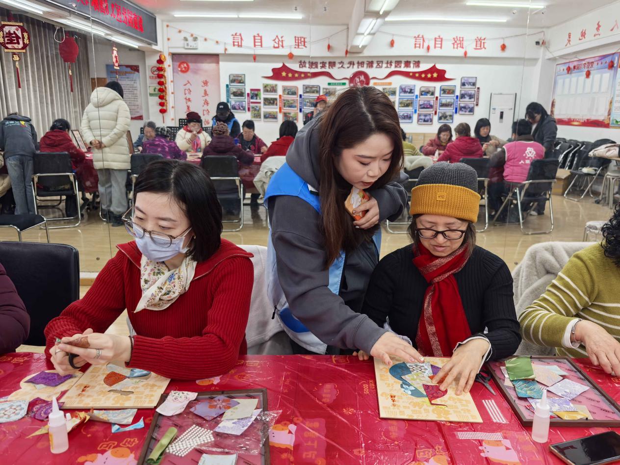 进入手工制作环节,居民们兴致盎然,纷纷拿起剪刀、胶水,将光滑的宋锦细心包裹在葫芦模具上,再缀以珠饰点缀细节。尽管多数人是初次尝试,但大家热情不减、互帮互学。遇到操作难题时,邻座的“姐妹”志愿者主动伸出援手,现场洋溢着团结友爱、温馨和谐的氛围。从勾勒轮廓、包裹塑形到点缀纹样、细节完善,一个个朴素的葫芦模具,在大家的巧手中逐渐变得精致美观,每一件作品都承载着对生活的美好期许与节日祝福。