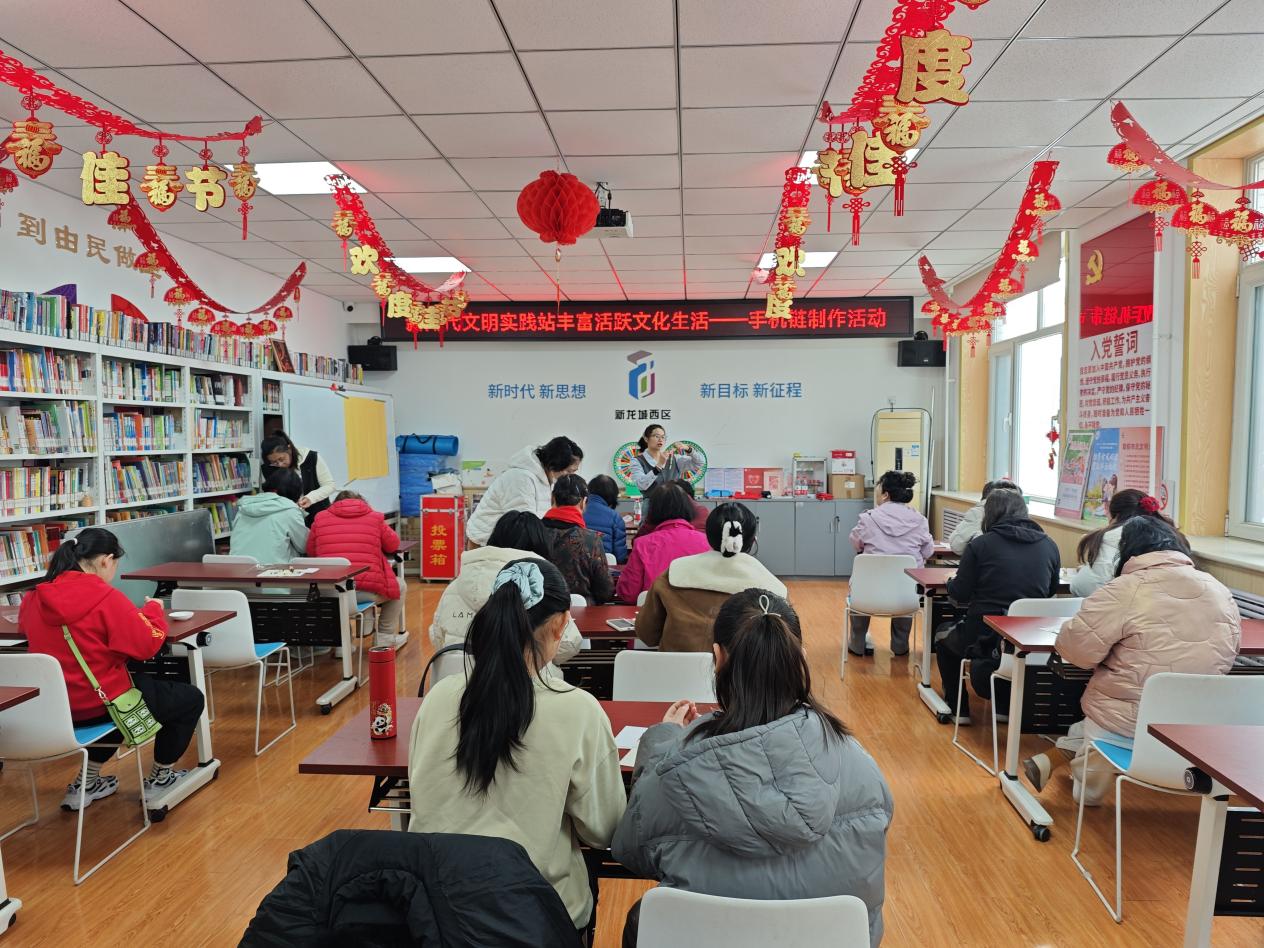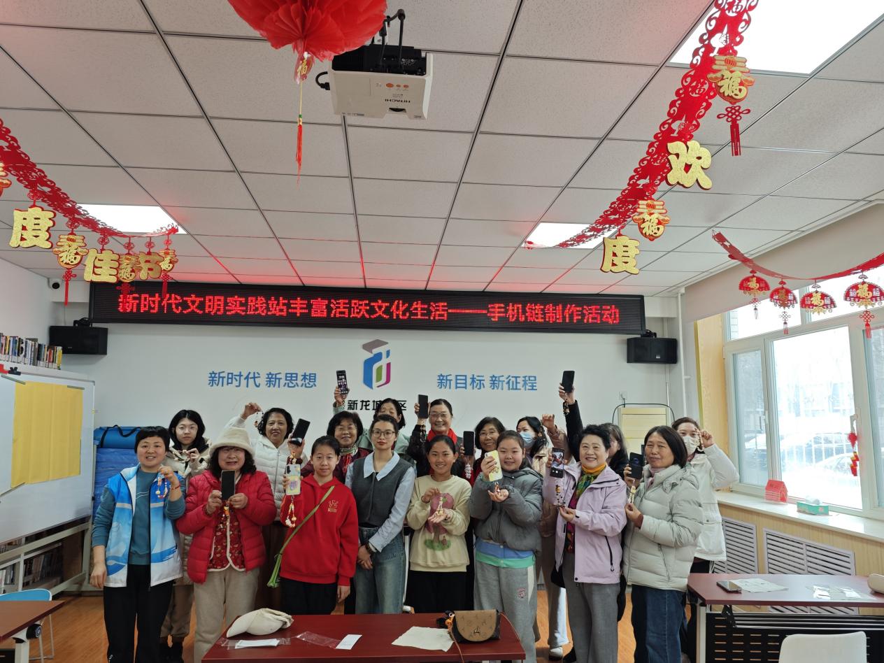 志愿者老师首先登场,现场示范编织、打结、串珠等技巧,细致讲解配色搭配与创意构思,并耐心解答亲子家庭的疑问。在制作过程中,孩子们在妈妈、奶奶的陪伴下认真穿珠、精心搭配,家长们则悉心指导,亲子间默契配合,现场笑语连连。一件件色彩缤纷、独具创意的手机链相继成型,有的简约清新,有的童趣十足,每一件都承载着满满的爱意与祝福。活动尾声,大家手持作品合影留念,定格下这美好的瞬间。此次活动不仅让女性居民在手工创作中放松身心、感受节日温暖,更以手作为纽带拉近了亲子距离,营造了尊重女性、邻里和睦的和谐社区氛围。