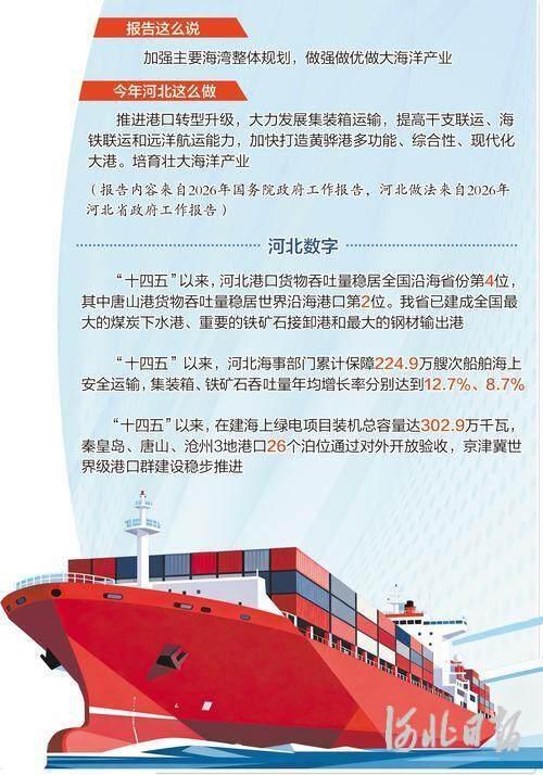 政府工作报告提出,加强主要海湾整体规划,做强做优做大海洋产业。出席全国两会的我省代表委员表示,港口是做强做优做大海洋产业的宝贵资源。河北要抓住机遇,持续推进港口转型升级和资源整合,优化港口功能布局,强化港口能力建设,加快临港产业发展,更好地把沿海优势转化为发展优势。