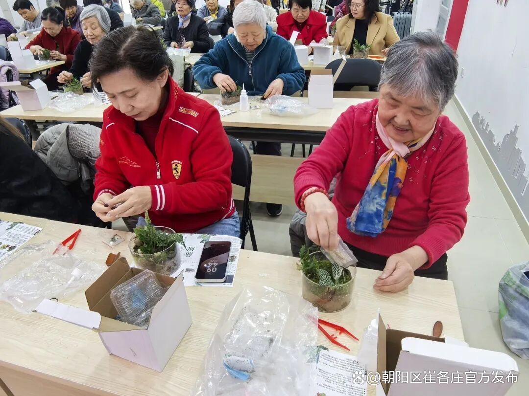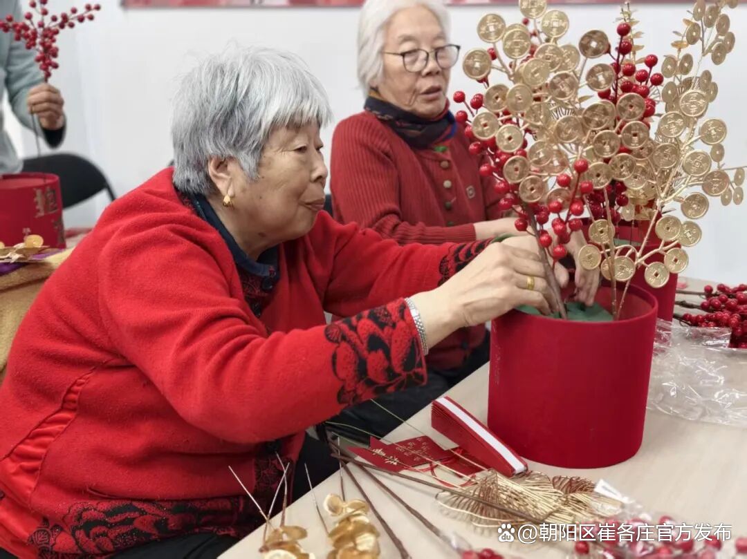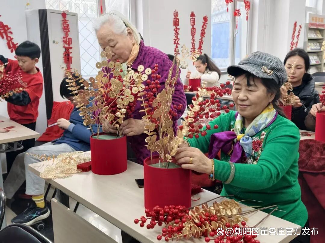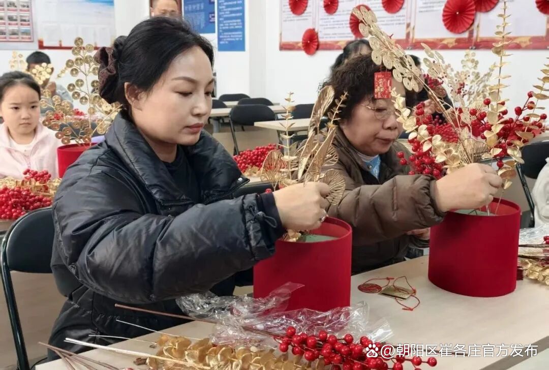 在老师指导下,居民们兴致勃勃动手创作,固定花泥、挑选主枝、修剪枝叶、搭配挂饰,彼此交流心得、分享乐趣。一个个精致喜庆的福桶相继诞生,既装点了节日氛围,更将满满的福气与美好寓意带回家。