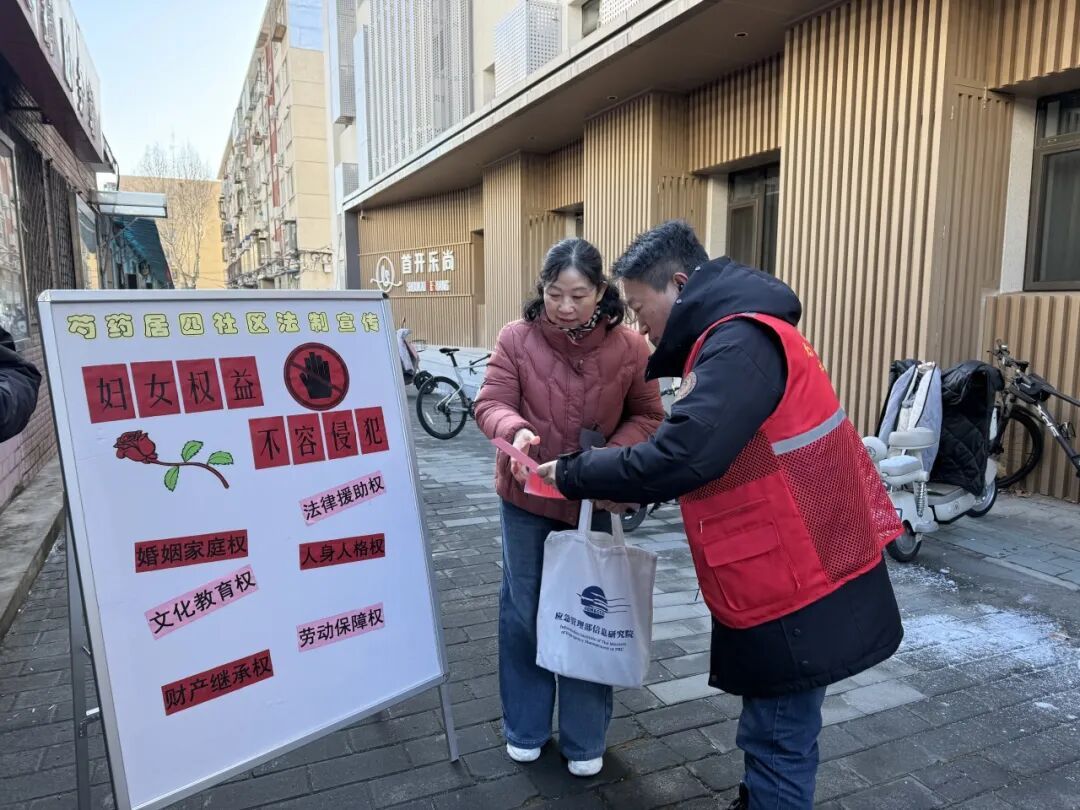 芍药居四社区在发放宣传页的同时,用通俗语言解读女性权益知识,鼓励姐妹们学法用法、自信自强。