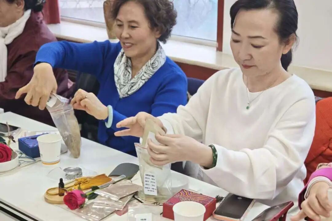 芍药居六社区的“姐妹团”则开启了一场“草木凝香 手作雅韵”的芳香之旅,研磨、调香、压模……将沉香、檀木、薄荷、茉莉的芬芳凝固成一块块绘有莲花、平安、观音等吉祥图案的精致香牌,这是属于“她们”的独特芳香,更是一趟舒缓疗愈的心灵之旅。