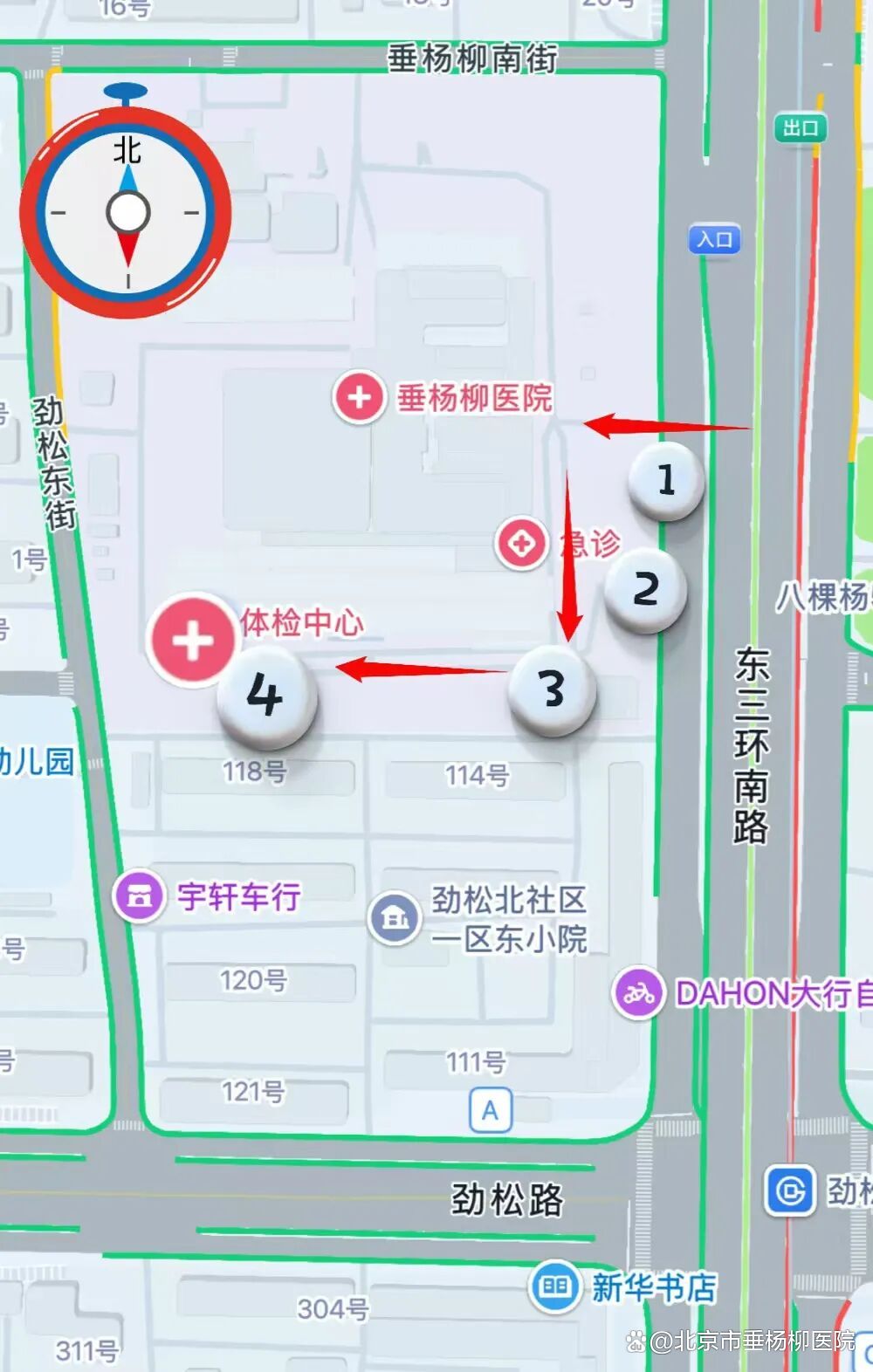 清华大学附属垂杨柳医院体检中心通行路线:从东三环东侧进入医院,沿院内路引向南行走30米,右拐向西直行50米,从体检中心入口进入即可。